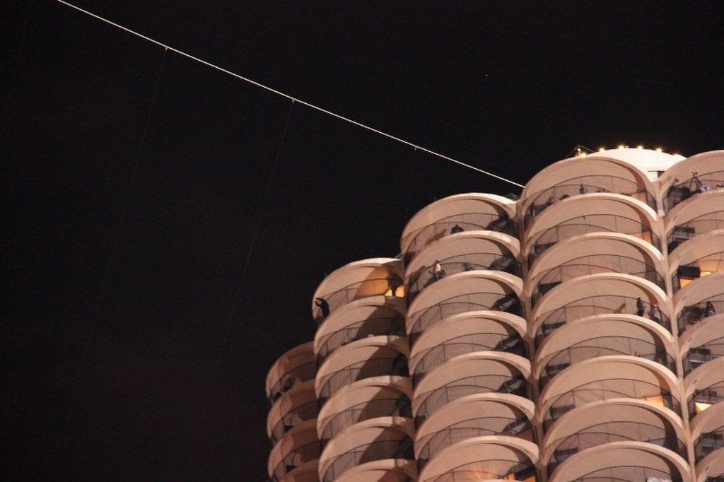 Pierwszy spacer rozpoczął się w zachodniej wieży Marina City, a zakończył na dachu budynku Leo Burnette. Trasę, która wznosiła się do góry pod kątem 19 stopni, Nik Wallenda pokonał w 6 minut i 51 sekund. Szedł szybko i zdecydowanie.