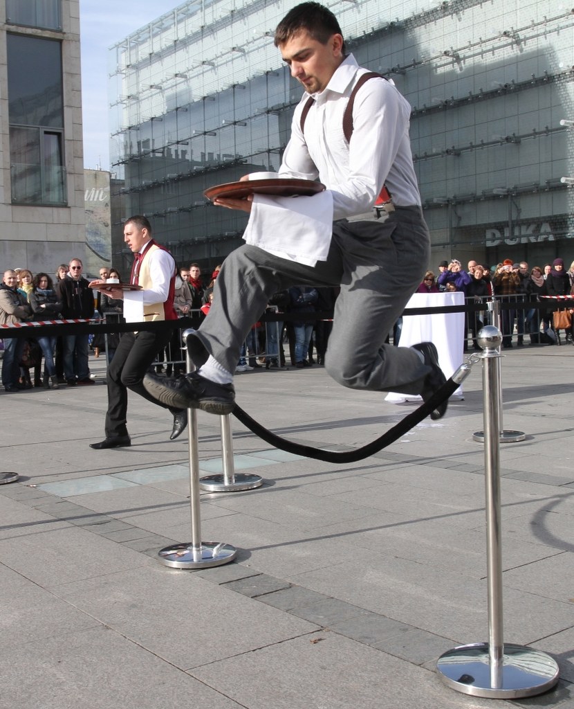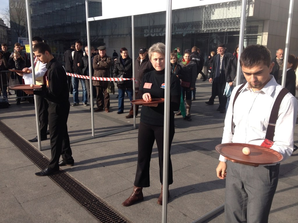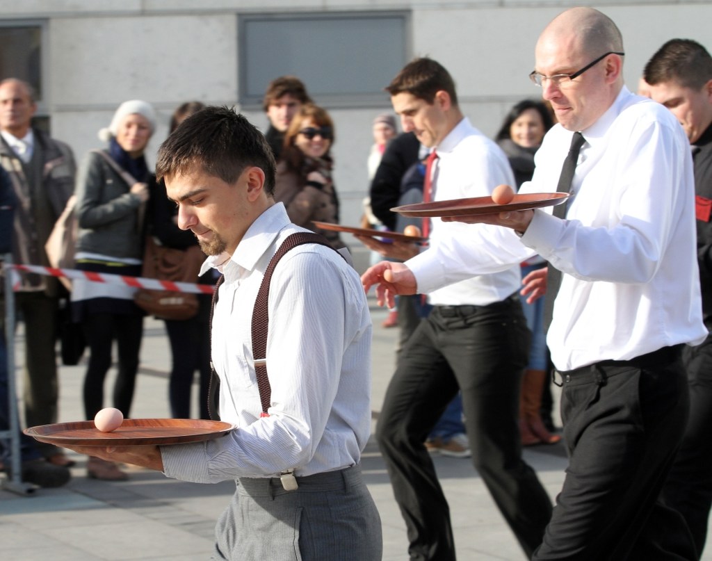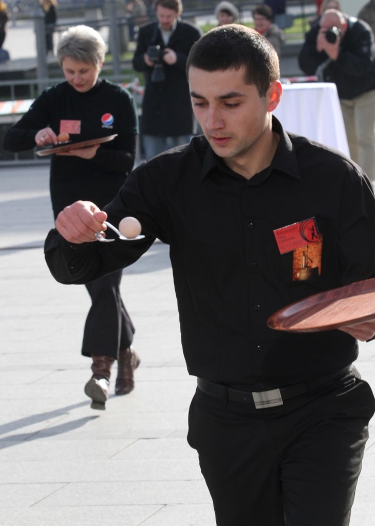 Finał to sprint na 100 metrów z jajkiem. Najpierw jajko leżało na tacy, ale po 50 metrach kelnerzy musieli je przełożyć na łyżkę i donieść do mety.