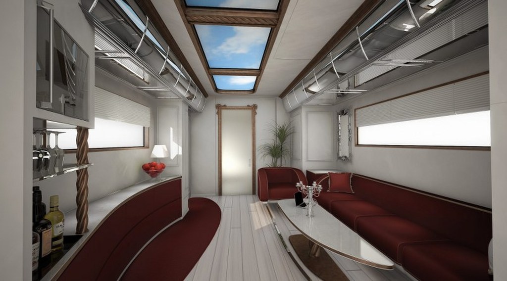 Do dyspozycji podróżujących jest również kominek, barek, telewizja satelitarna i wiele innych udogodnień. Powierzchnia pojazdu to około 40 m2, maksymalną prędkość jaką osiąga to 150 km/godz.