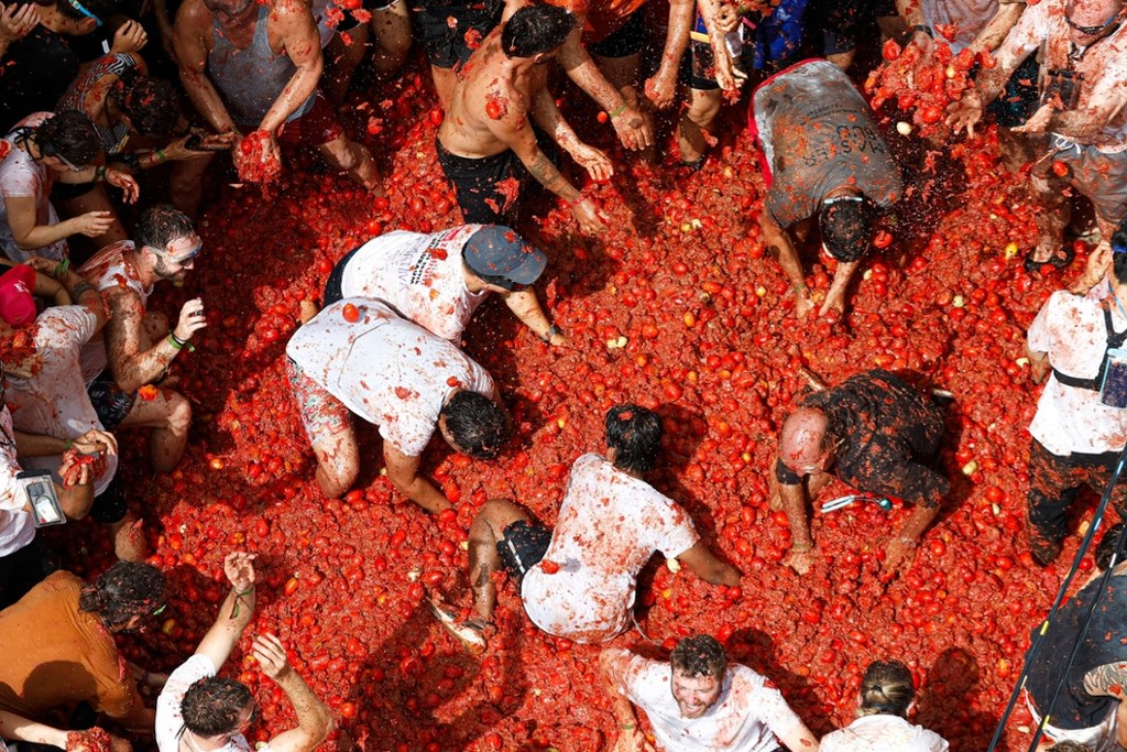 Ponad 20 tysięcy osób z całego świata wzięło udział w tegorocznej Tomatinie – słynnej bitwie na pomidory w hiszpańskim Buñol. Ulice miasta po raz kolejny zamieniły się w czerwone morze, a uczestnicy mieli do dyspozycji 120 ton dojrzałych pomidorów.