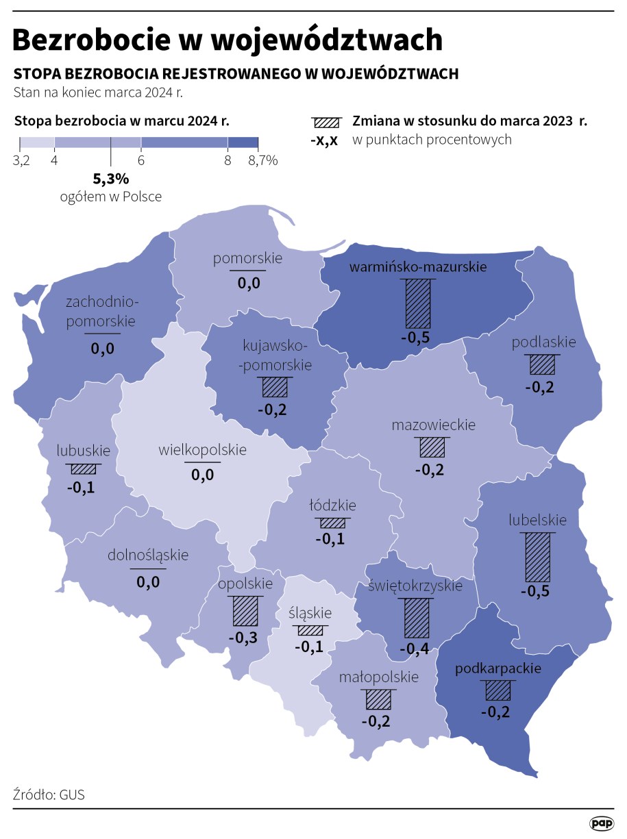 Stopa bezrobocia w Polsce nieznacznie spadła. W marcu 2024 r. wyniosła 5,3 proc. wobec 5,4 proc. miesiąc wcześniej - podał Główny Urząd Statystyczny.