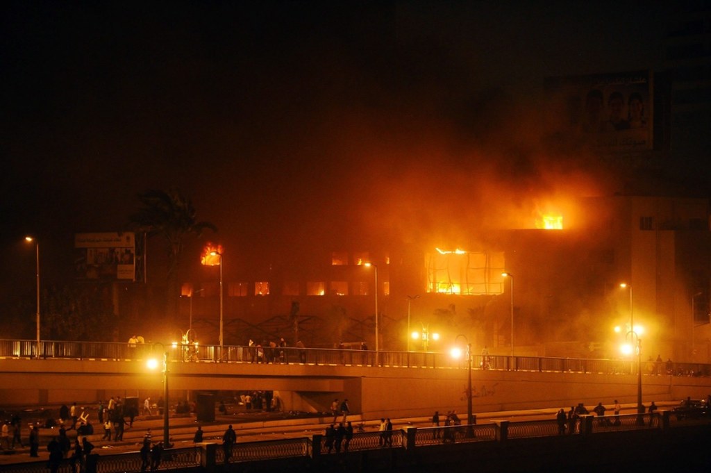 Budynek rządzącej w Egipcie Partii Narodowo-Demokratycznej podpalony przez protestujących. / PAP/EPA