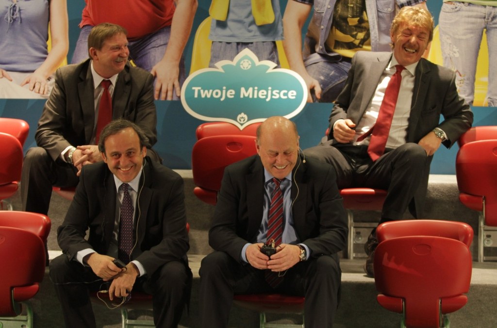 Ceremonia rozpoczęcia sprzedaży biletów na turniej finałowy EURO 2012. Uroczystość uświetnili m.in. Michael Platini, Grzegorze Lato, Zbigniew Boniek i Andrzej Szarmach / PAP