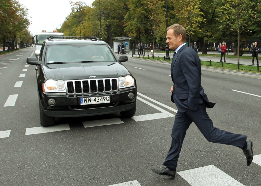 Premier Donald Tusk przebiega przez przejście dla pieszych w drodze do swojej kancelarii / PAP