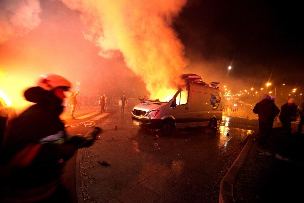 Strażacy gaszą podpalony wóz transmisyjny TVN24. Zamieszki na Placu Na Rozdrożu, gdzie z Placu Konstytucji dotarł Marsz Niepodległości / PAP