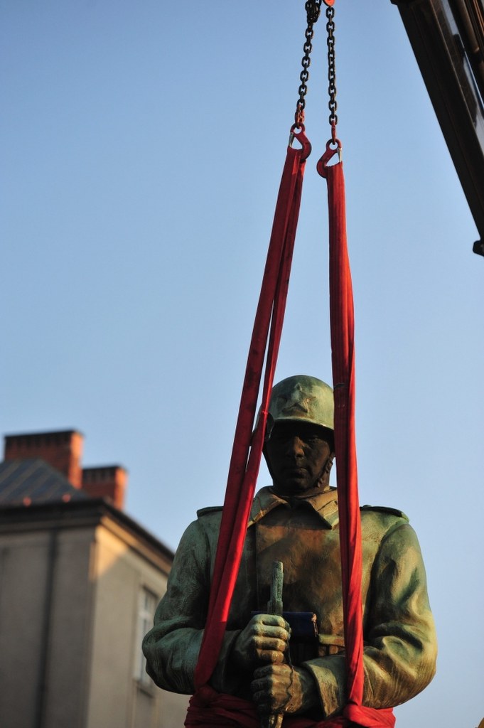 Demontaż pomnika "Czterech śpiących" na pl. Wileńskim w Warszawie. Został rozebrany i będzie przeniesiony w związku z budową II linii metra / PAP