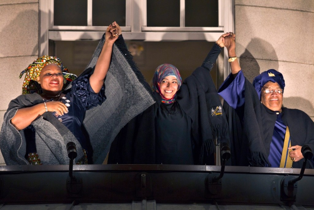 Laureatki Pokojowej Nagrody Nobla, Gbowee, Karman i Johnson-Sirleaf, cieszą się po ogłoszeniu werdyktu / PAP/EPA