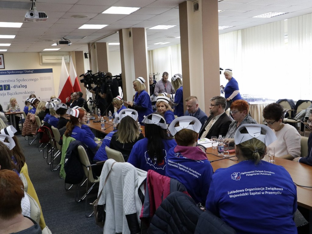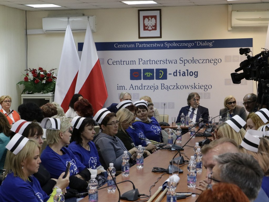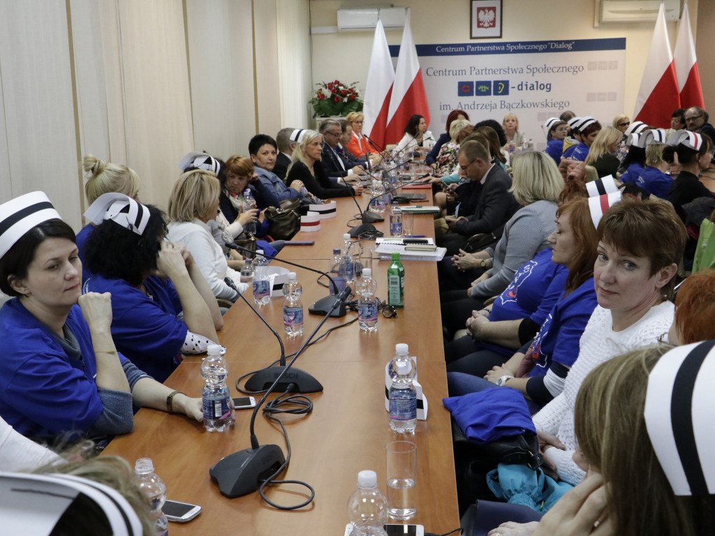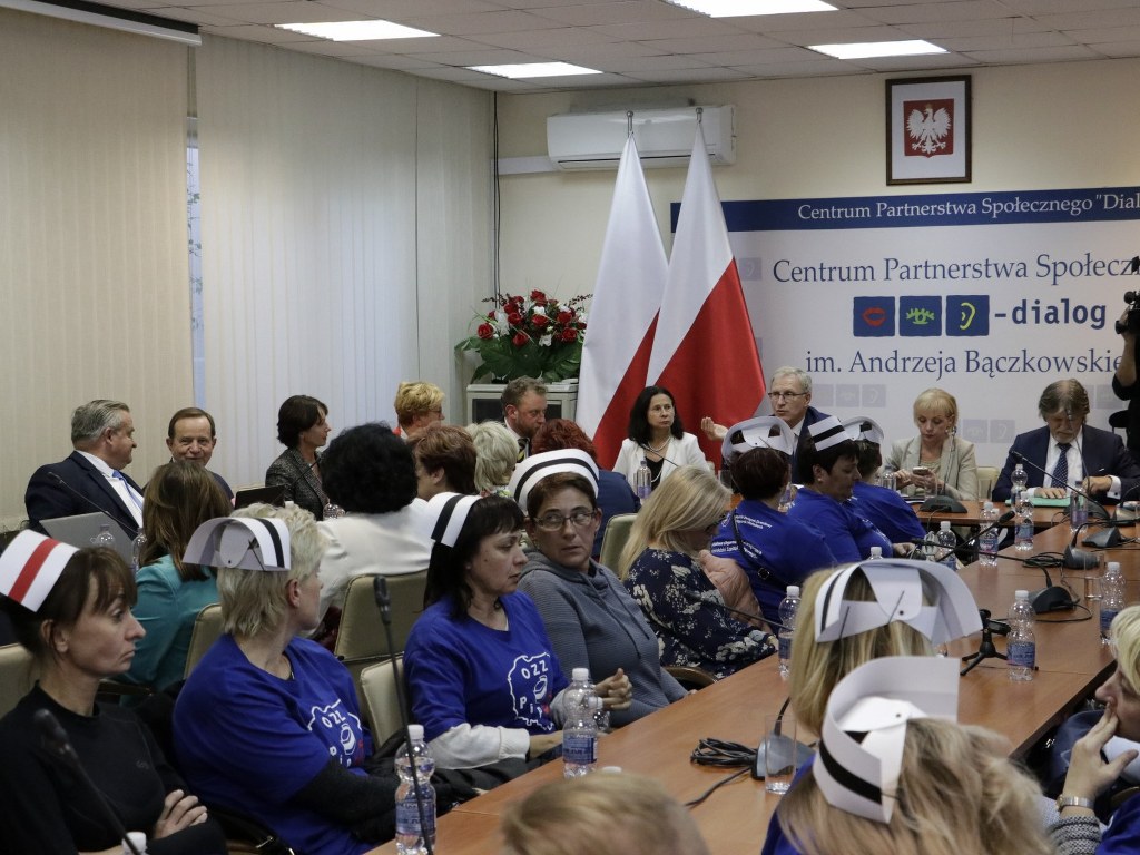 W czwartek odbyło się spotkanie głodujących pielęgniarek z Przemyśla w Centrum Dialog w Warszawie. W rozmowach uczestniczył między innymi szef resortu zdrowia Łukasz Szumowski. "Nie możemy powiedzieć, że jesteśmy zadowolone, musimy to przeanalizować" - powiedziały protestujące. Wcześniej pielęgniarki, którym towarzyszył były minister zdrowia z Platformy Obywatelskiej Bartosz Arłukowicz, nie zostały wpuszczone do Sejmu.