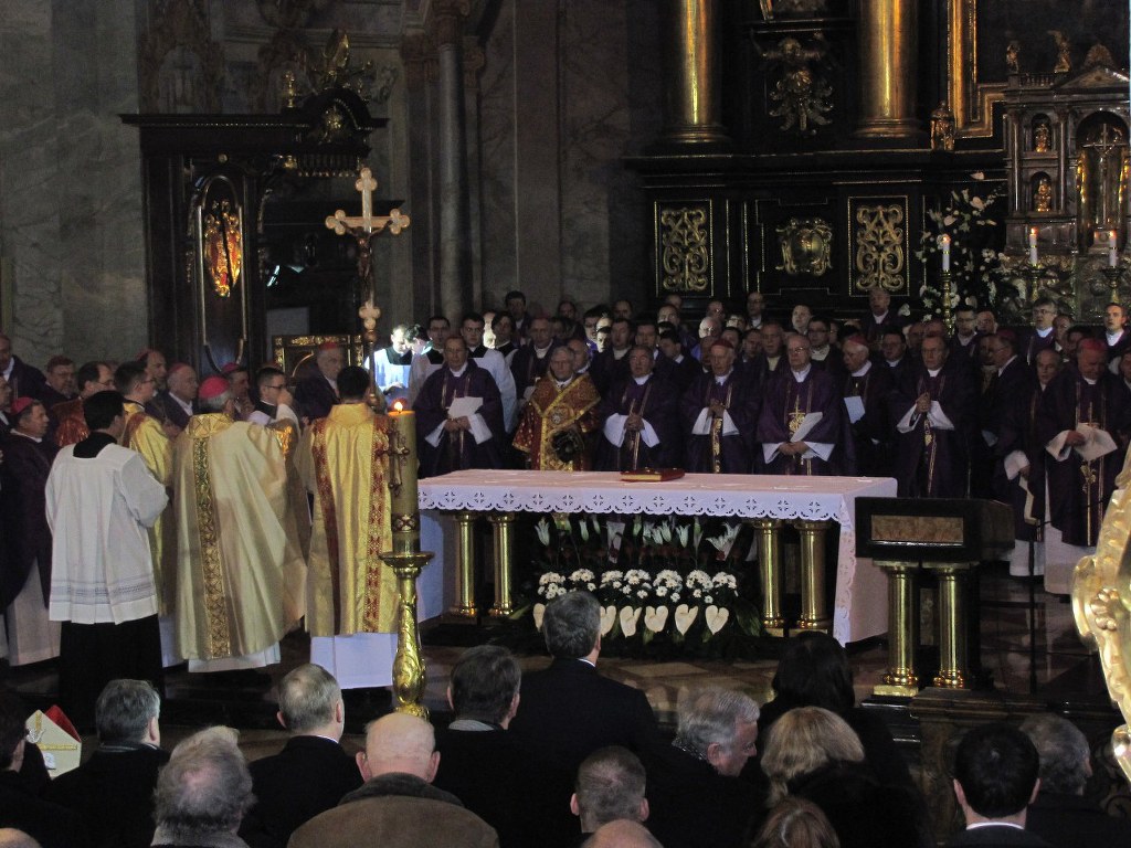 Na pogrzeb przybyli liczni dostojnicy kościelni, przedstawiciele władz centralnych i regionalnych, parlamentarzyści. Wielotysięczne rzesze wiernych zgromadziły się przed świątynią, gdzie ustawiono telebimy, na których można oglądać transmisję uroczystości.