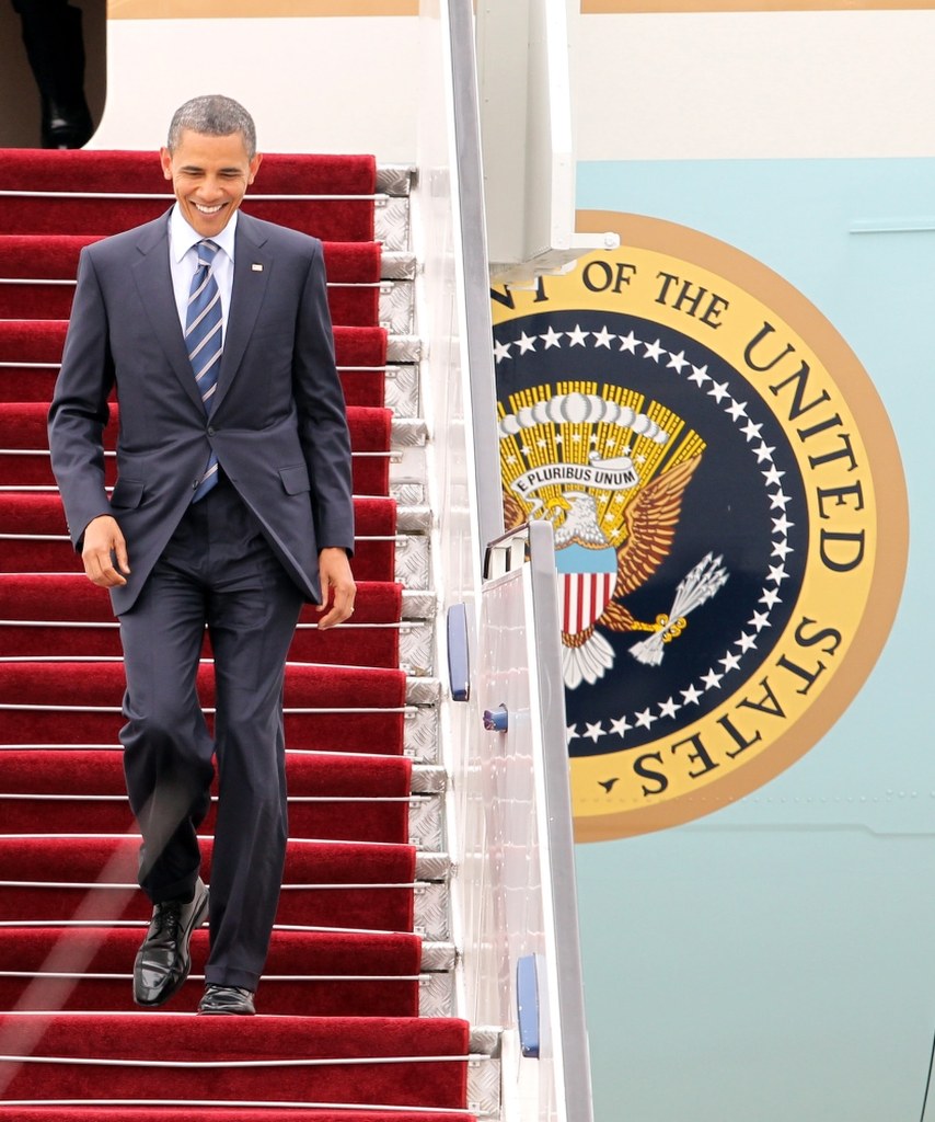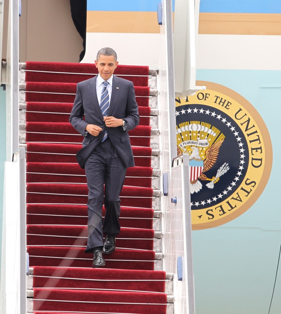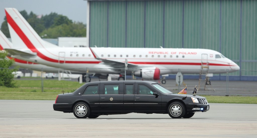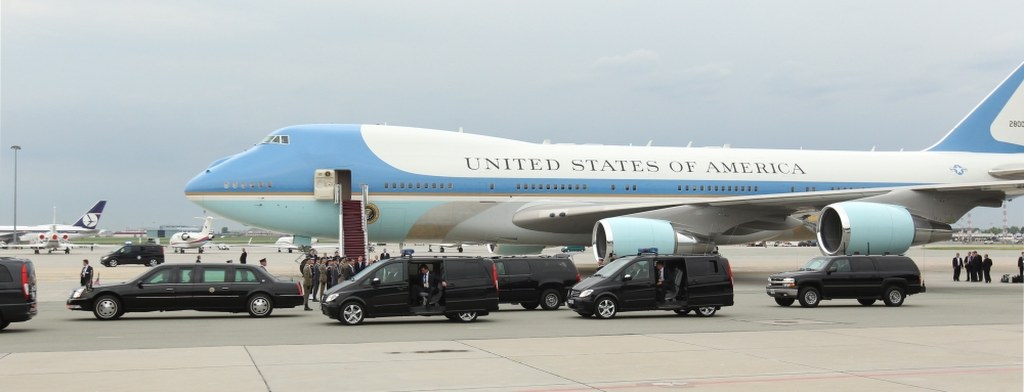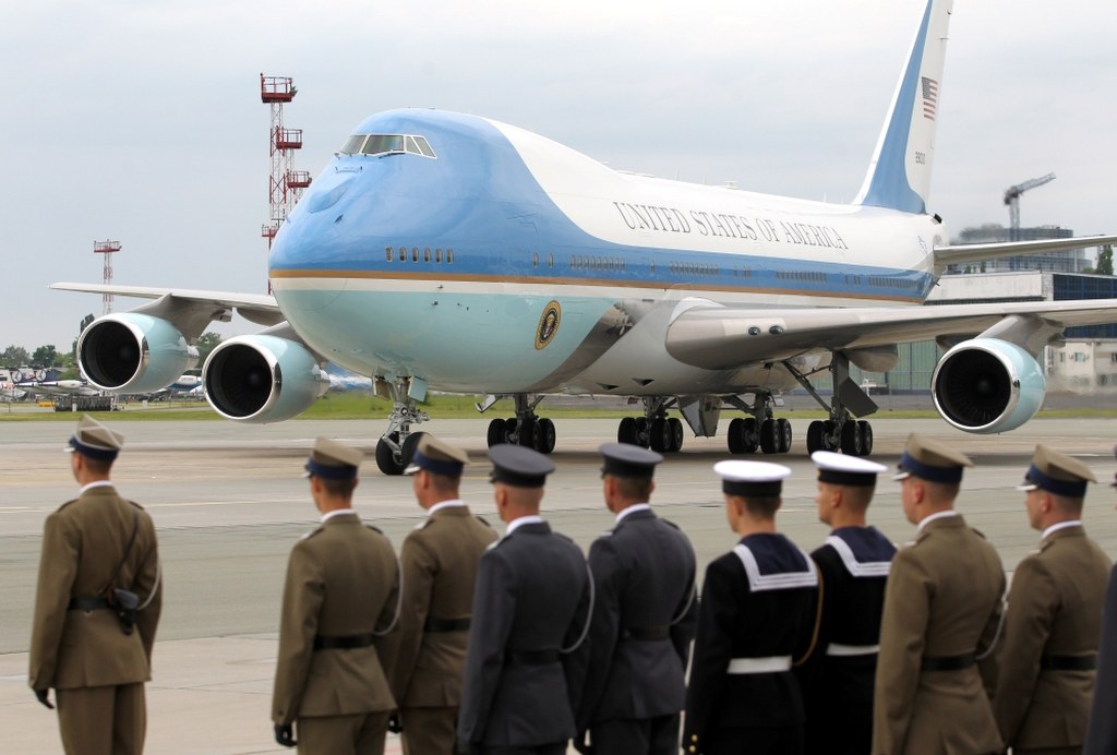 Amerykański prezydent przybył do Polski na pokładzie specjalnego samolotu Boeing VC-25A, stanowiącym przeróbkę popularnego jumbo-jeta, z którego korzysta w podróżach po kraju i świecie. Z chwilą wejścia głowy państwa na pokład któregoś z tych samolotów otrzymuje on radiowy sygnał wywoławczy "Air Force One". Kryptonim ten zastrzeżono dla każdego samolotu sił powietrznych USA, w którym przebywa urzędujący prezydent Stanów Zjednoczonych.