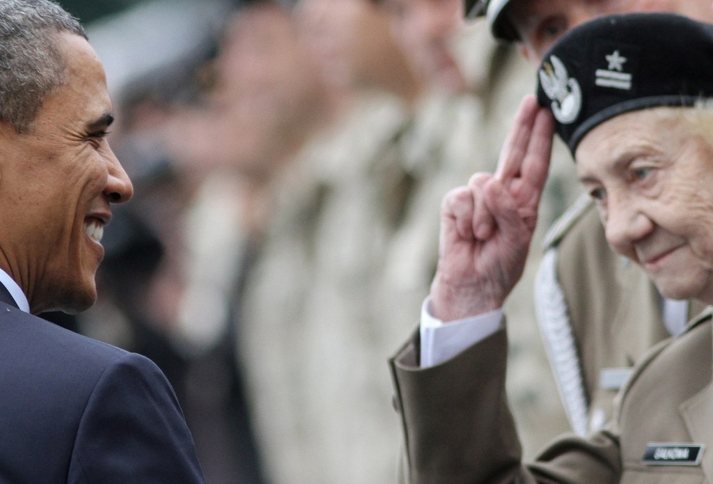 Następnie prezydent USA przywitał się ze zgromadzonymi na uroczystości przedstawicielami kombatantów i wojskowych; uścisnął dłonie wielu z nich, z niektórymi krótko rozmawiał.