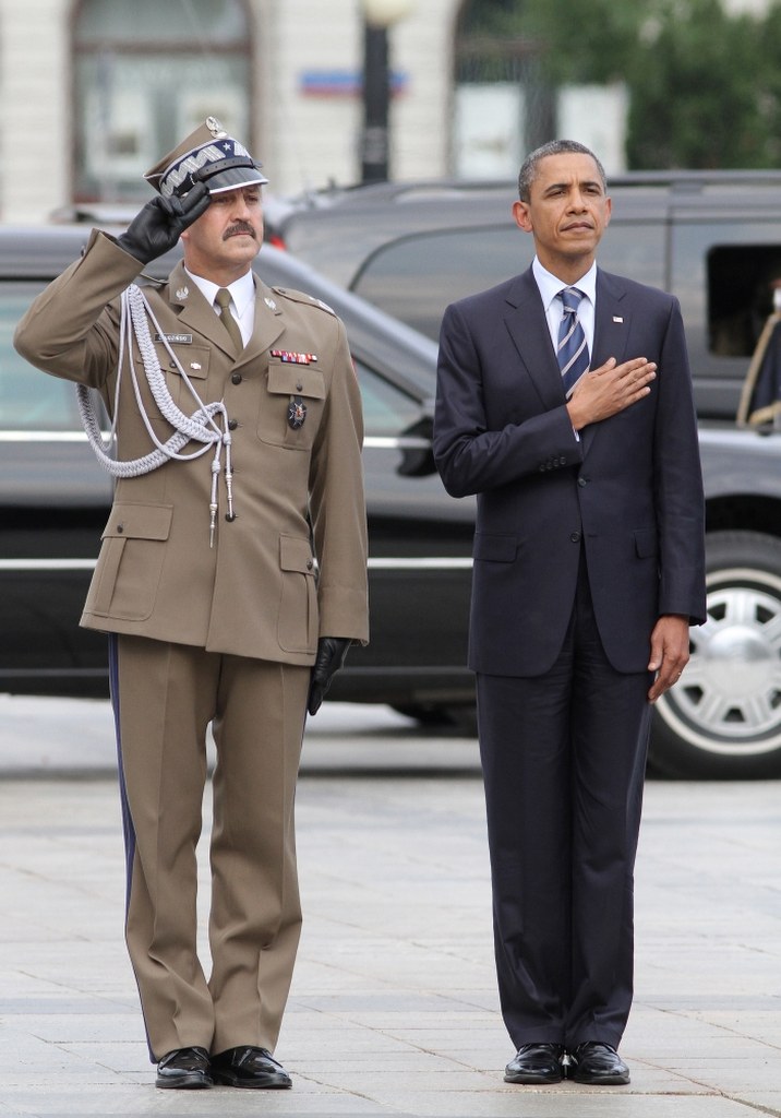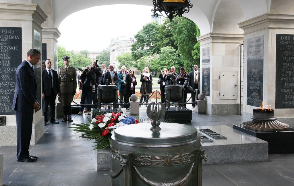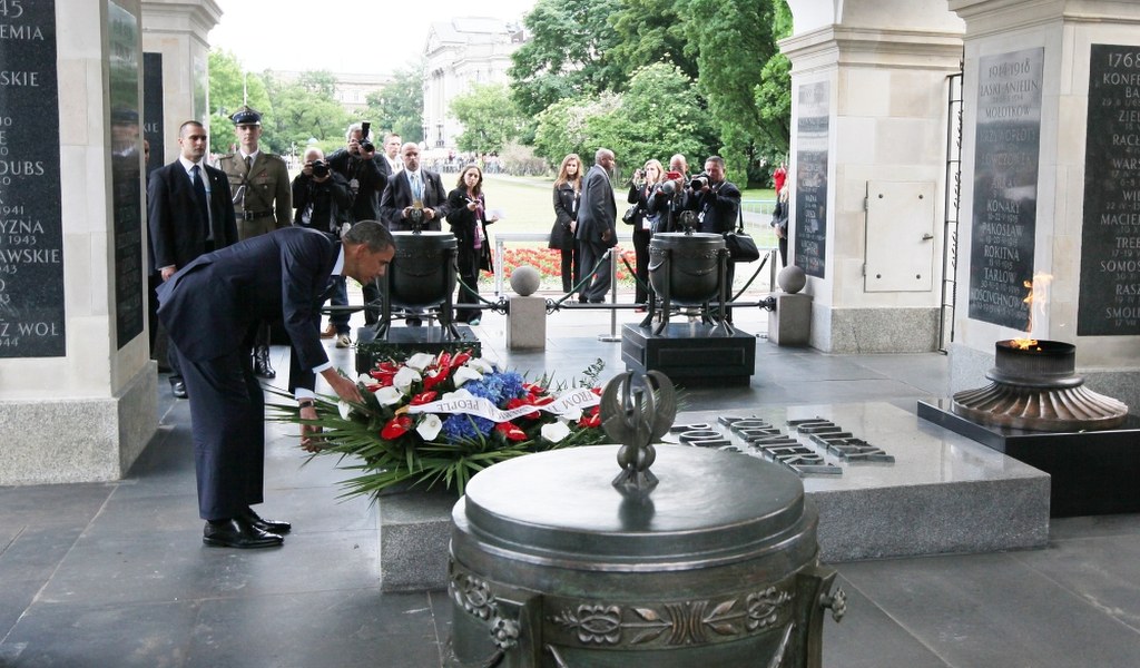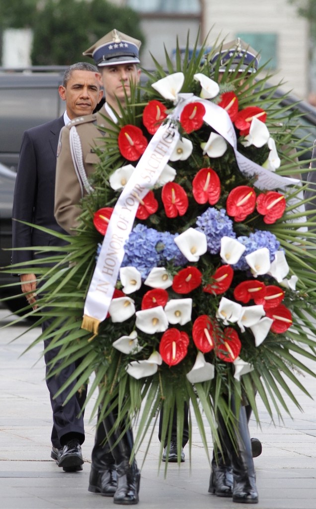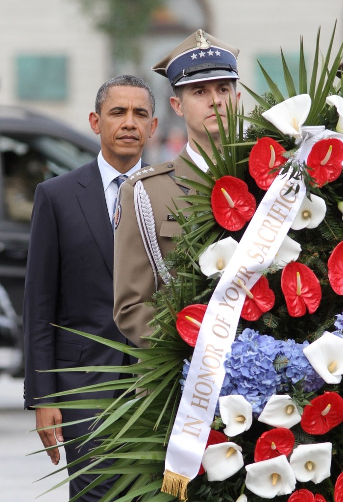 Amerykański prezydent przed Grobem Nieznanego Żołnierza złożył wieniec z biało-czerwono-niebieskich kwiatów. Przed ceremonią odegrany został hymn Stanów Zjednoczonych, po niej rozbrzmiał hymn Polski. Chwilę potem wpisał się do pamiątkowej księgi. "W hołdzie nieznanemu żołnierzowi - prezydent Stanów Zjednoczonych" - napisał Obama.