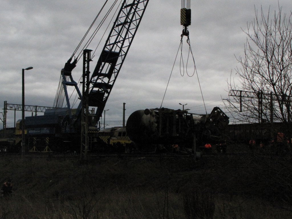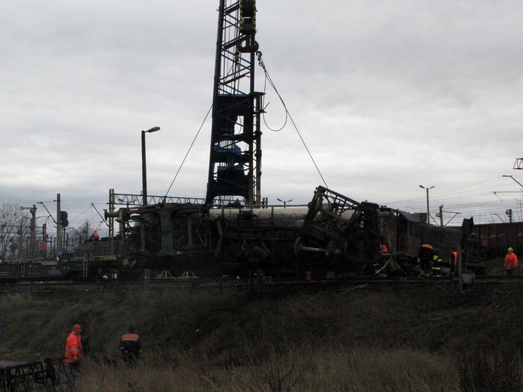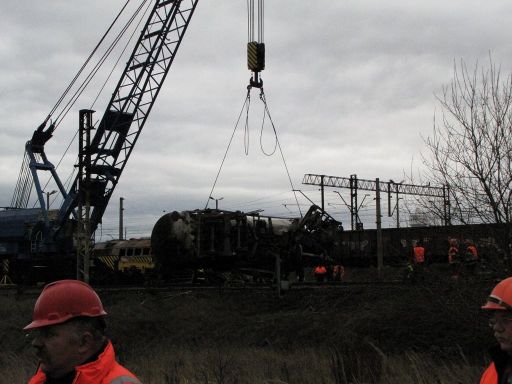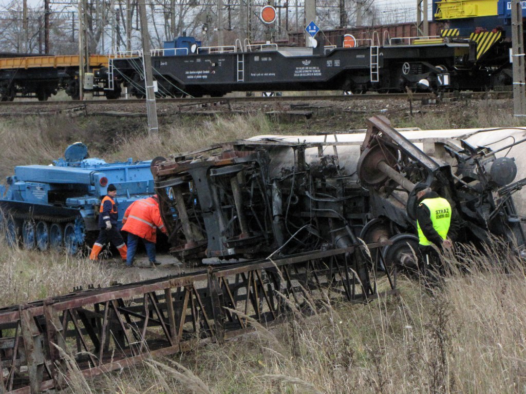 Pierwszą cysternę udało się zdjąć z szyn dopiero przed godz. 13. Przygotowania do tej akcji trwały kilka godzin, trzeba było usunąć spaloną trakcję elektryczną. Operacja nie jest łatwa, torowisko jest zniszczone, co utrudnia przemieszczanie dźwigu.