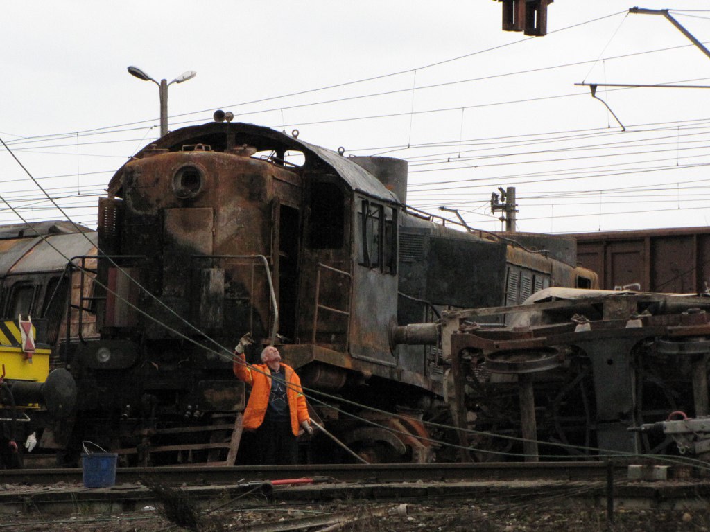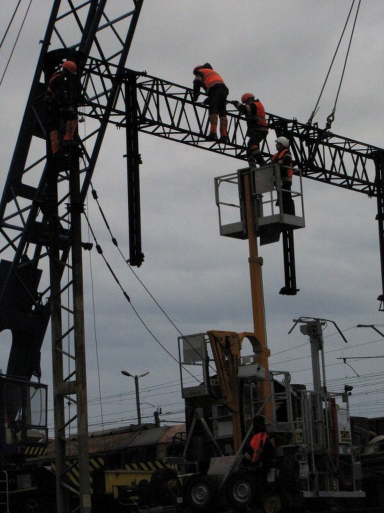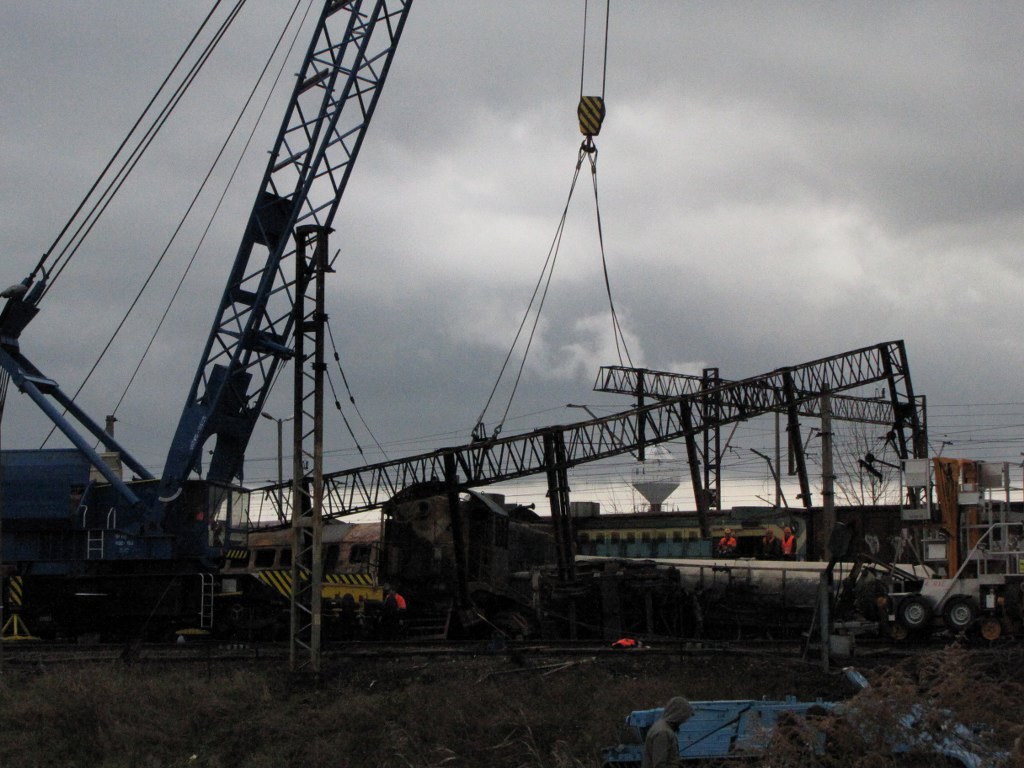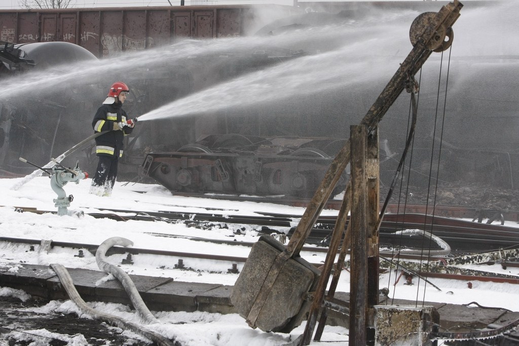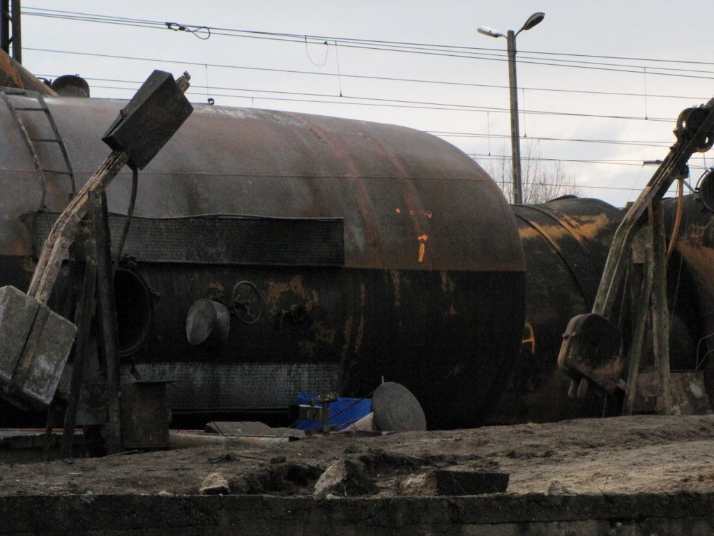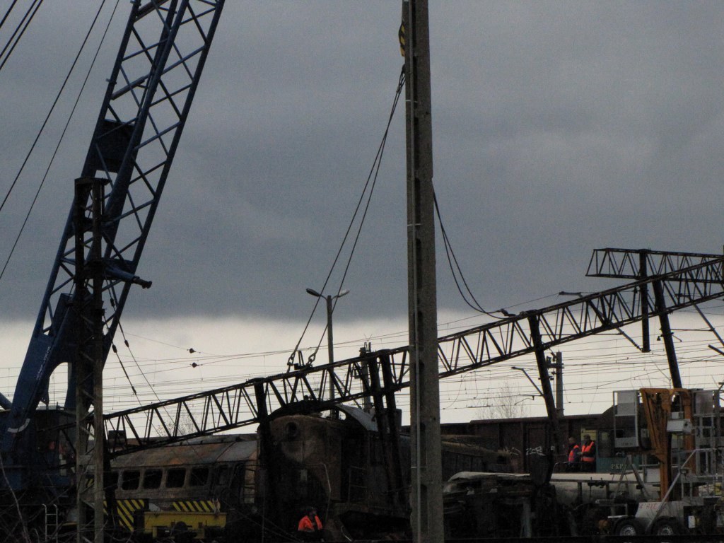 Rano na miejsce przyjechał tzw. pociąg ratunkowy, wyposażony w duży dźwig. W tej chwili ten dźwig po kolei podnosi spalone wagony i lokomotywy i odkłada je obok torowiska. Tam czeka już specjalny pojazd gąsienicowy wyglądający prawie jak czołg. On odholowuje cysterny na bok, by zrobić miejsce na kolejne.