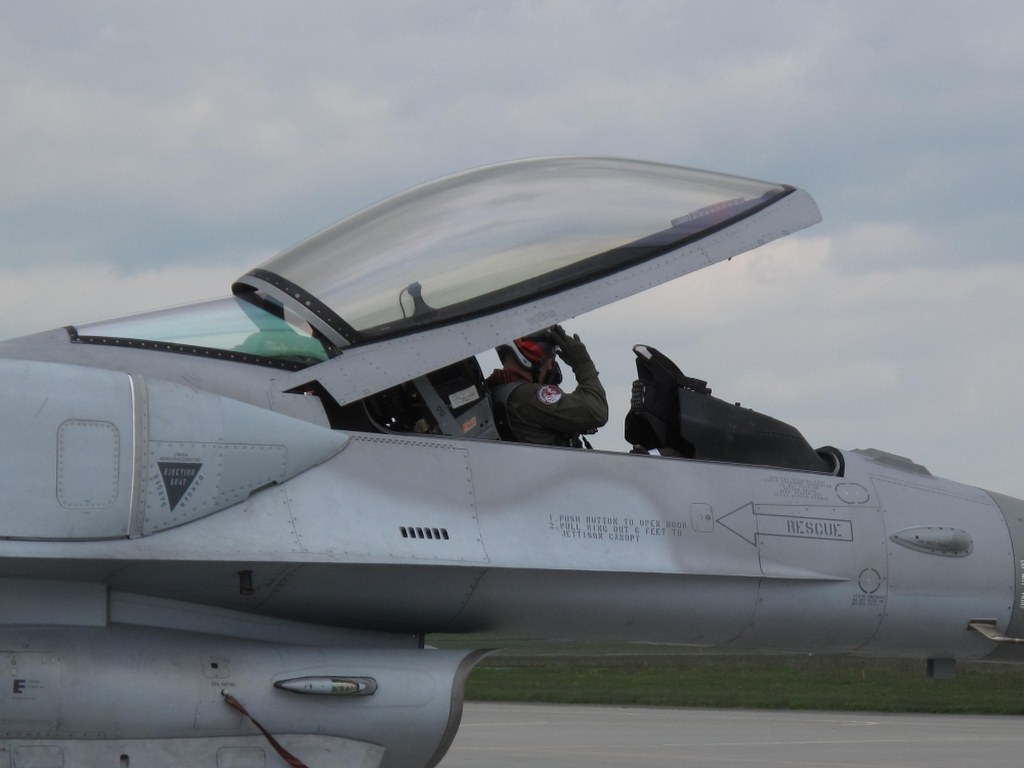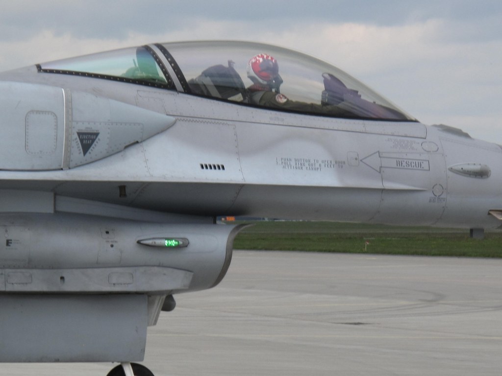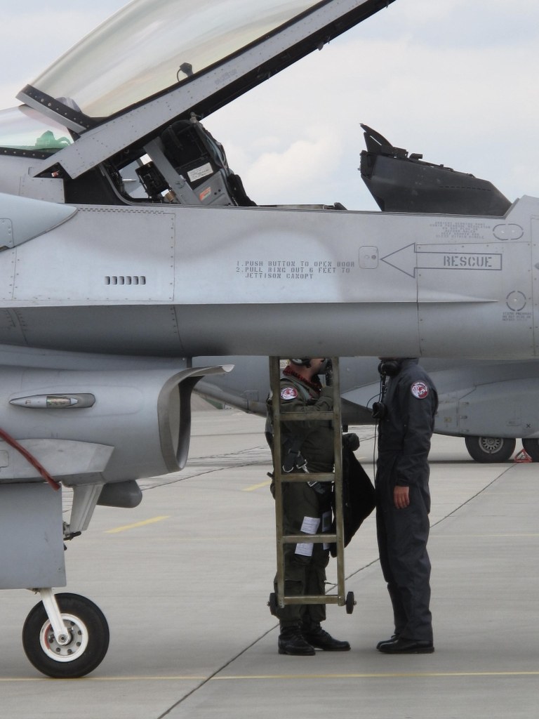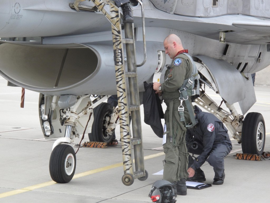 Do pokazów przeznaczone są dwa samoloty. Jak widać na zdjęciach, oznakowanie nie zostawia wątpliwości - to tygrys w pełnej krasie. Druga z wymalowanych maszyn jest na przeglądzie, dlatego w środę kpt. pil. Gałązka latał na innej maszynie. Jest to możliwe, bo polska grupa stwierdziła, że zamierza odrywać się od ziemi, ale nie od codzienności - wybrane do pokazów F16 mogą też uczestniczyć w akcjach bojowych, podobnie jak piloci delegowani do Tiger Demo Team. Żeby usiąść za sterami pokazowego F16, trzeba być instruktorem i z tego obowiązku szkoleniowego kpt. Gałązka nie rezygnuje.