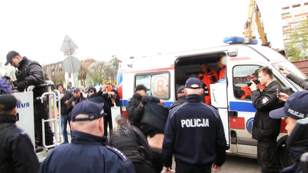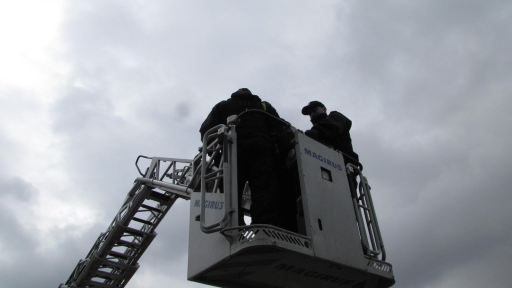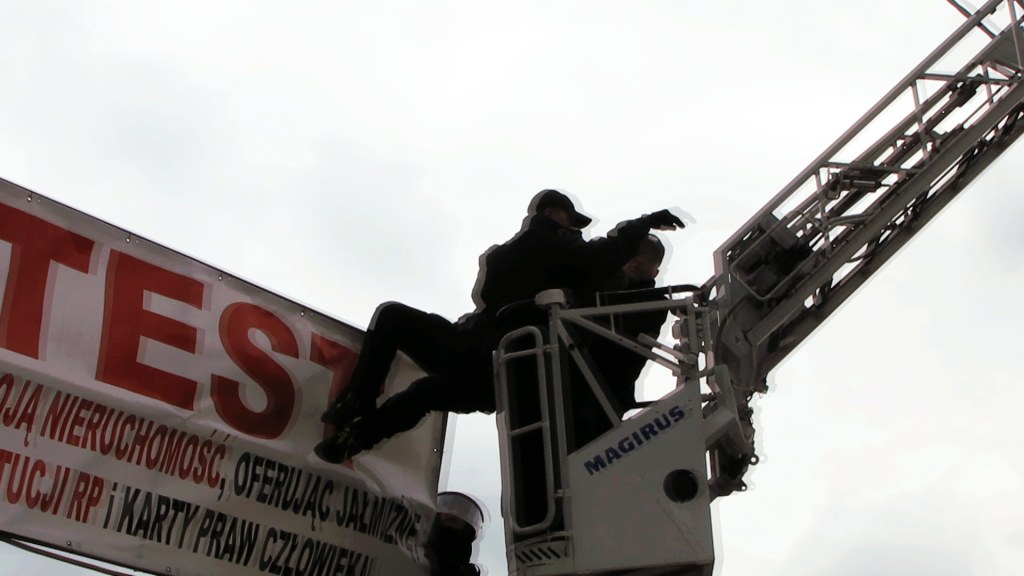 Właściciel działki stał natomiast przypięty łańcuchem do słupa podtrzymującego transparent, ok. 3 metry nad ziemią. Twierdził, że nie pozwoli rozebrać garaży, które znajdują się na działce.