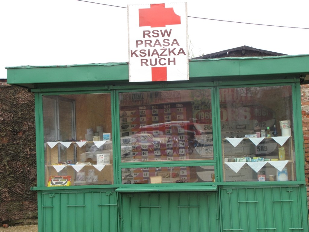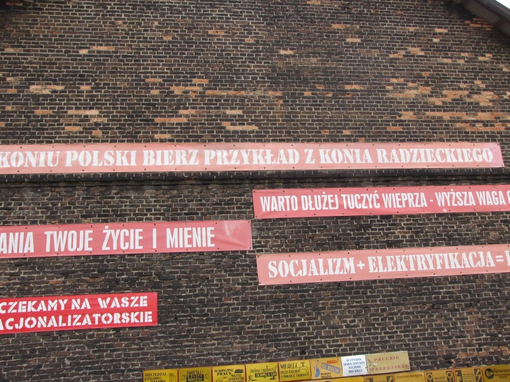 "Witamy przodowników pracy" - takie hasło wisi nad głowami tych, którzy wchodzą na teren muzeum. Nieco dalej inne, charakterystyczne dla tamtego okresu napisy. Wszystkie są oryginalne. Jedno z haseł robi szczególne wrażenie: "Koniu polski! Bierz przykład z konia radzieckiego!". A tuż obok słynny uliczny kiosk, w którym można było wtedy kupić wszystko. Za szybą widać m.in. płatki mydlane, maszynki do golenia na żyletki czy paczkę słynnych papierosów Carmen.