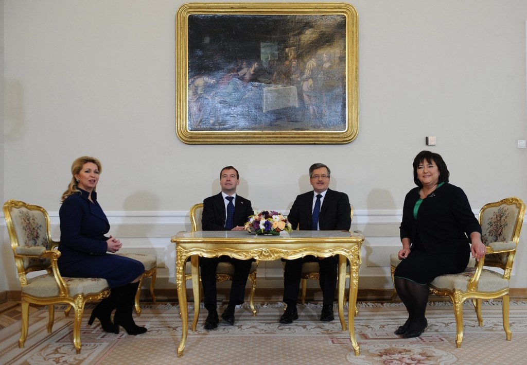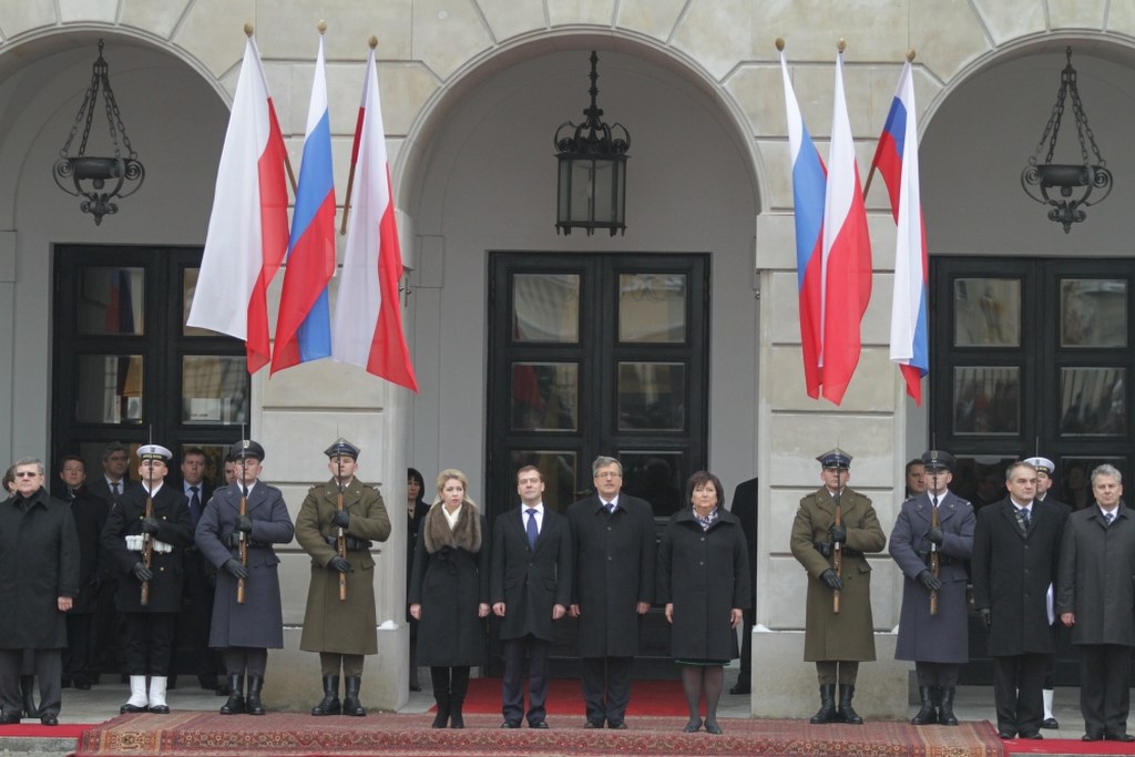 Oficjalna część wizyty rozpoczęła się uroczystym powitaniem na dziedzińcu Pałacu Prezydenckiego. Następnie prezydenci w towarzystwie żon udali się na krótką rozmowę. Później Komorowski z Miedwiediewem spotkają się w "cztery oczy". Potem rozpoczną się rozmowy obu delegacji.