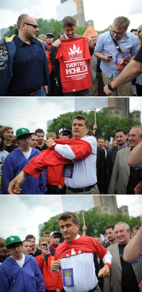 Na demonstracji pojawił się były poseł PO Janusz Palikot, który rozdawał ulotki, nawołujące do głosowania na jego ruch, bowiem ma on w programie legalizację marihuany.