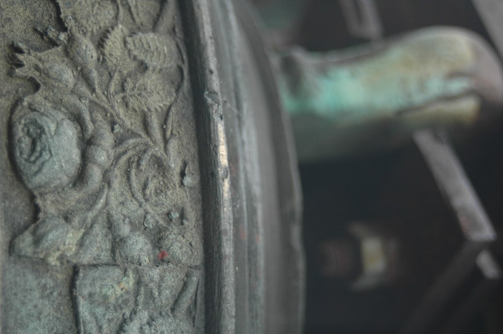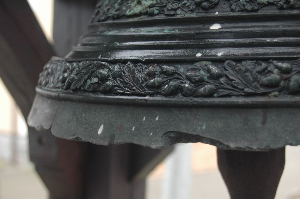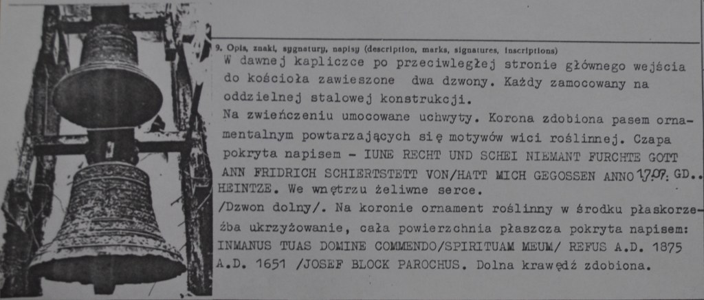 Dzwony były zawieszone na dzwonnicy jeden pod drugim. Jeden z nich zdobiony jest pasem powtarzających się motywów roślinnych i widniał na nim napis w języku niemieckim "IUNE RECHT UND SCHEI NIEMANT FURCHTE GOTT ANN FRIDRICH SCHIERTSTETT VON/ HATT MICH GEGOSSEN ANNO 1707 GD. HEINTZE".