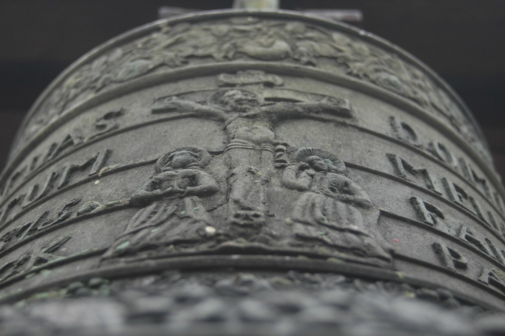 Na drugim dzwonie pośród ornamentów roślinnych przedstawiona była scena ukrzyżowania Jezusa Chrystusa i był umieszczony napis po łacinie ""INMANUS TUAS DOMINE COMMENDO/SPIRITUAM MEUM/ REFUS A.D. 1875 A.D. 1651/ JOSEF BLOCK PAROCHUS".