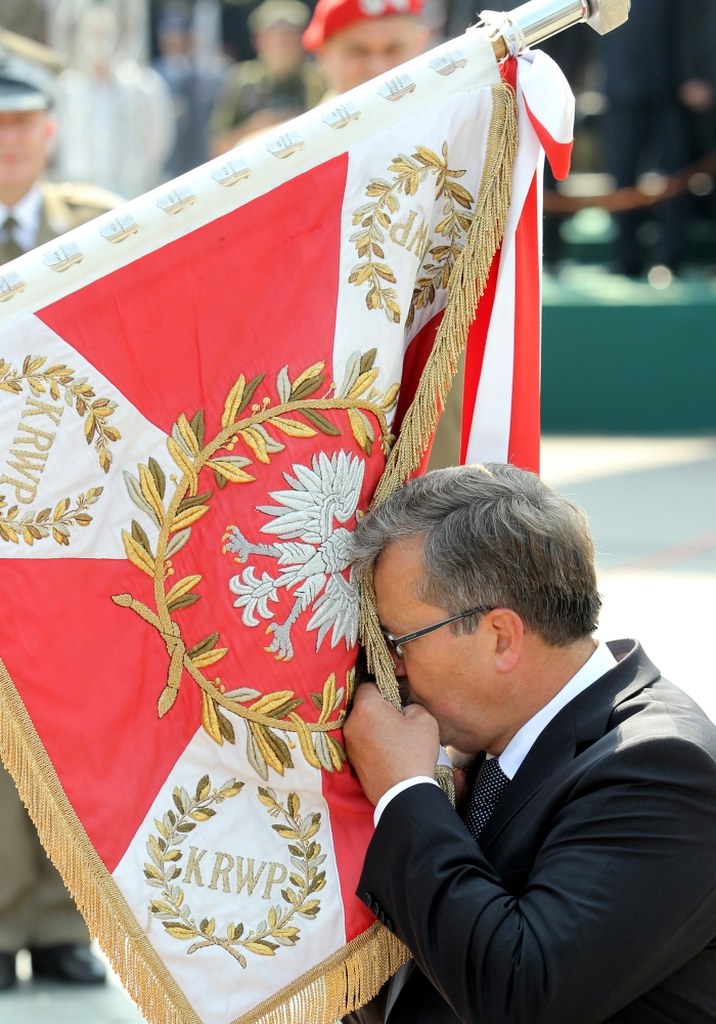 Trudno ukryć, a może i nie warto ukrywać wzruszenia w chwili, gdy syn, wnuk i potomek wielu, wielu innych pokoleń żołnierzy polskich klęka jako zwierzchnik Sił Zbrojnych i może całować sztandar Wojska Polskiego - powiedział prezydent. Trudno i chyba nie warto ukrywać wzruszenia, gdy ta uroczystość przejęcia zwierzchnictwa nad Siłami Zbrojnymi odbywa się tu przed Grobem Nieznanego Żołnierza, gdzie każdy z nas, każdy Polak może stanąć, zadumać się nad losami ojczyzny, być dumnym z poprzednich dokonań pokoleń żołnierskich, może być dumny ze swoich przodków, może myśleć z dumą także o przyszłości ojczyzny - mówił Bronisław Komorowski.