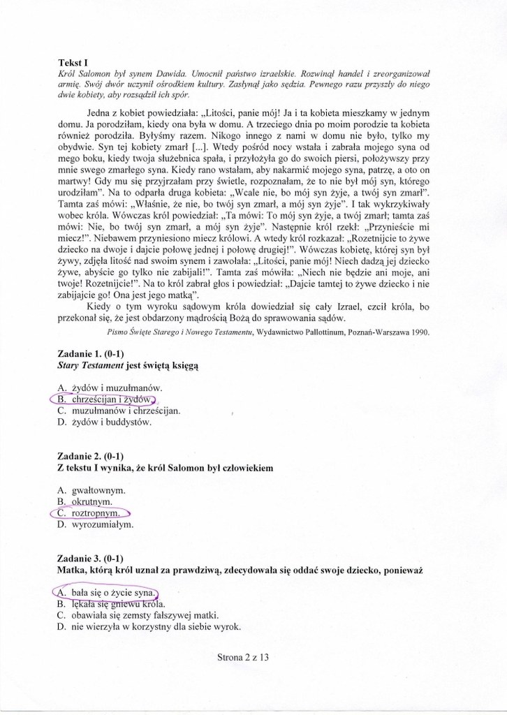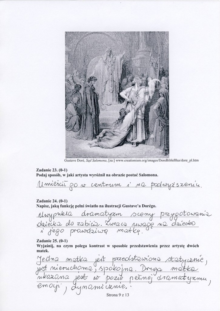 W zestawie były również zadania otwarte - uczeń musiał sam napisać odpowiedź na zadane pytania. Poza fragmentem Biblii i tekstem Tolkiena, zadania odnosiły się do reprodukcji biblijnego obrazu "Sąd Salomona" Gustave'a Dore'a oraz do wiersza "Ciężar" Leopolda Staffa.
