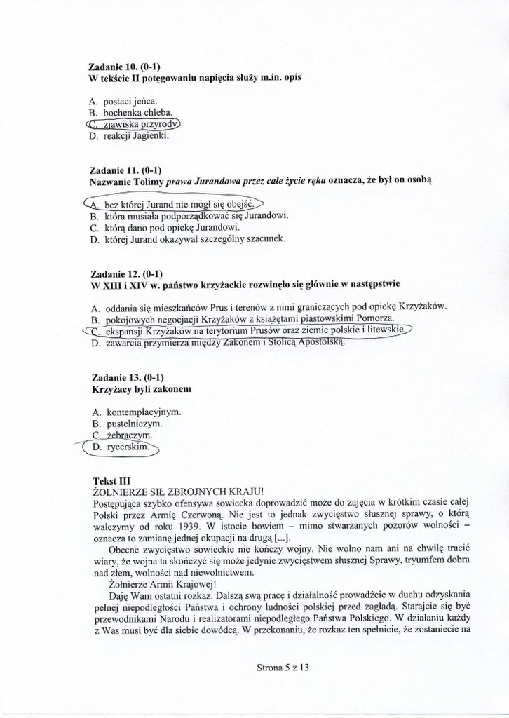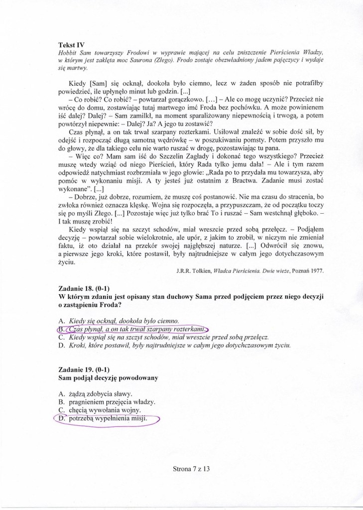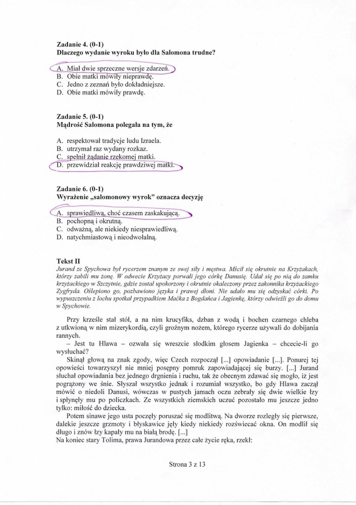 Wśród cytowanych tekstów, do których musieli się odnieść uczniowie, był fragment Starego Testamentu o roztropnym wyroku żydowskiego króla Salomona i fragment "Krzyżaków" Henryka Sienkiewicza, przywołujący postać Juranda ze Spychowa. Ponadto w teście pojawił się dramatyczny rozkaz gen. Leopolda Okulickiego do żołnierzy Armii Krajowej z 19 stycznia 1945 r., a także fragment powieści fantasy "Władca Pierścieni" Johna R.R. Tolkiena o odważnej decyzji hobbita Sama.