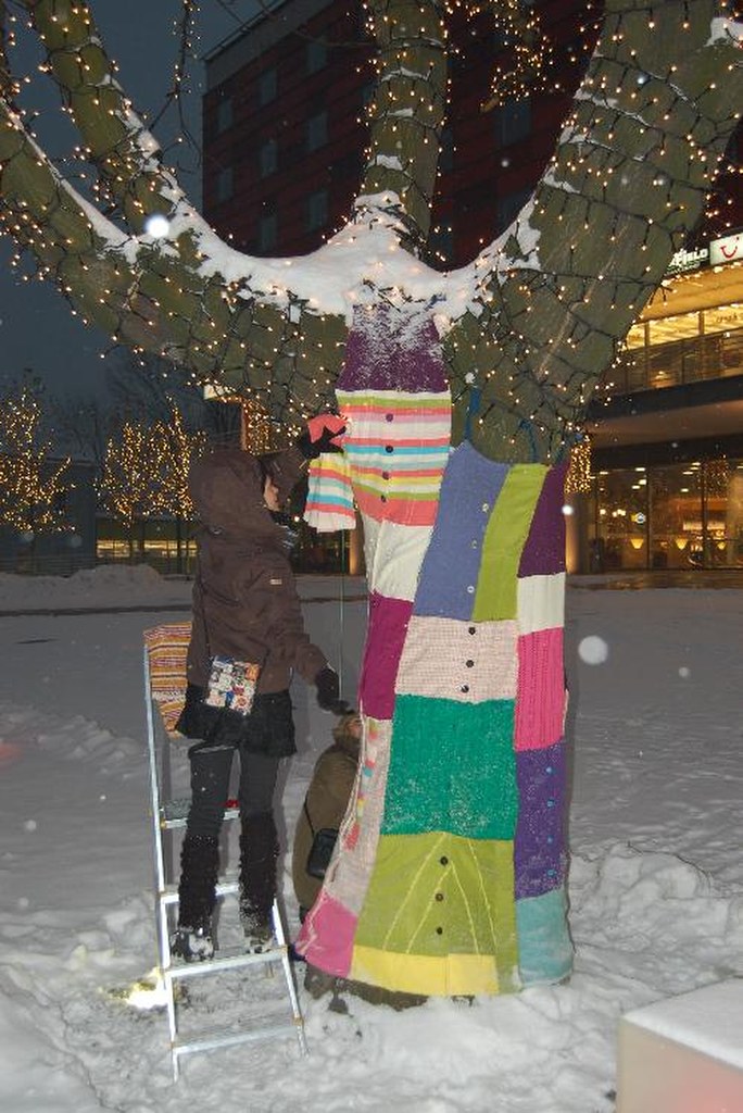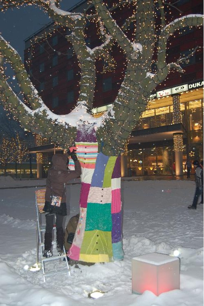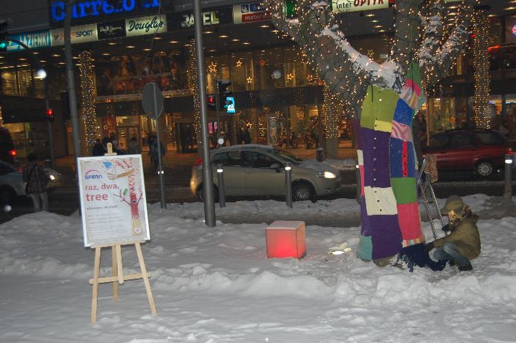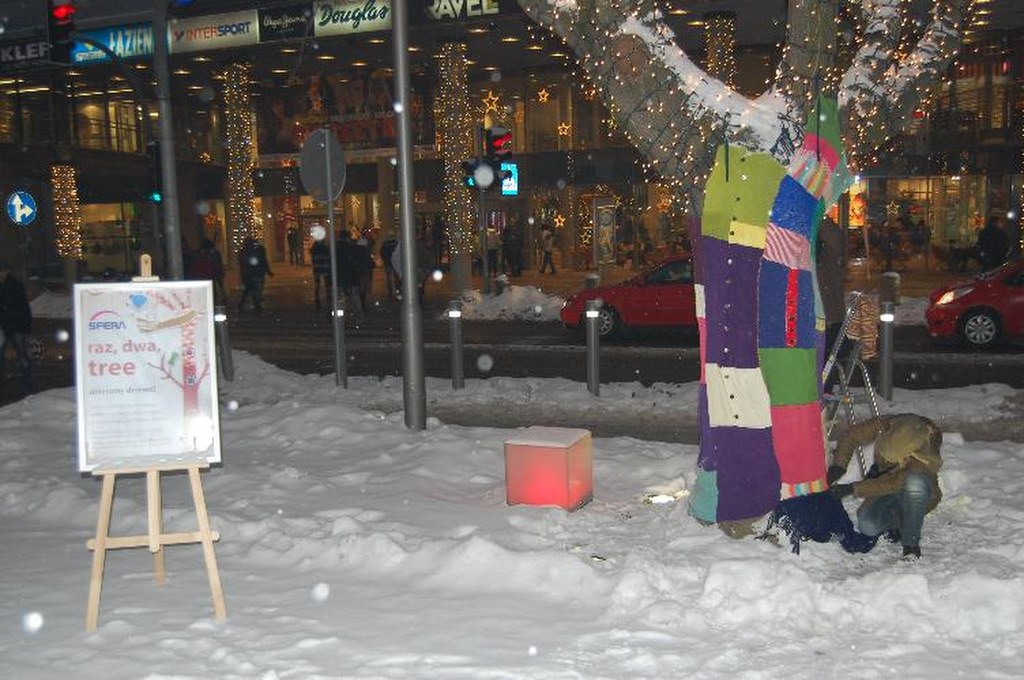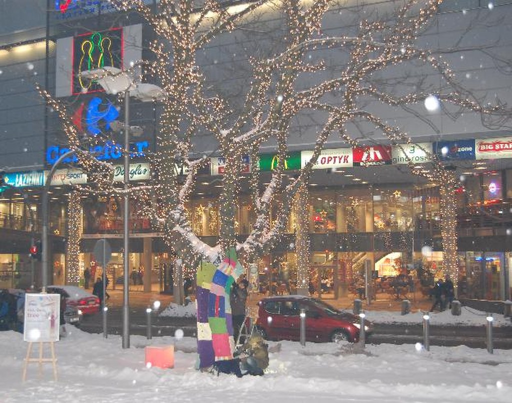 Małgorzata Markiewicz na oczach przechodniów ubrała dzisiaj jedno z drzew przed galerią handlową w Bielsku-Białej w patchworkowy, wełniany, ciepły "sweter". Jutro odbędzie się druga część happeningu. Akcji towarzyszy zbiórka ubrań dla najuboższych mieszkańców miasta.