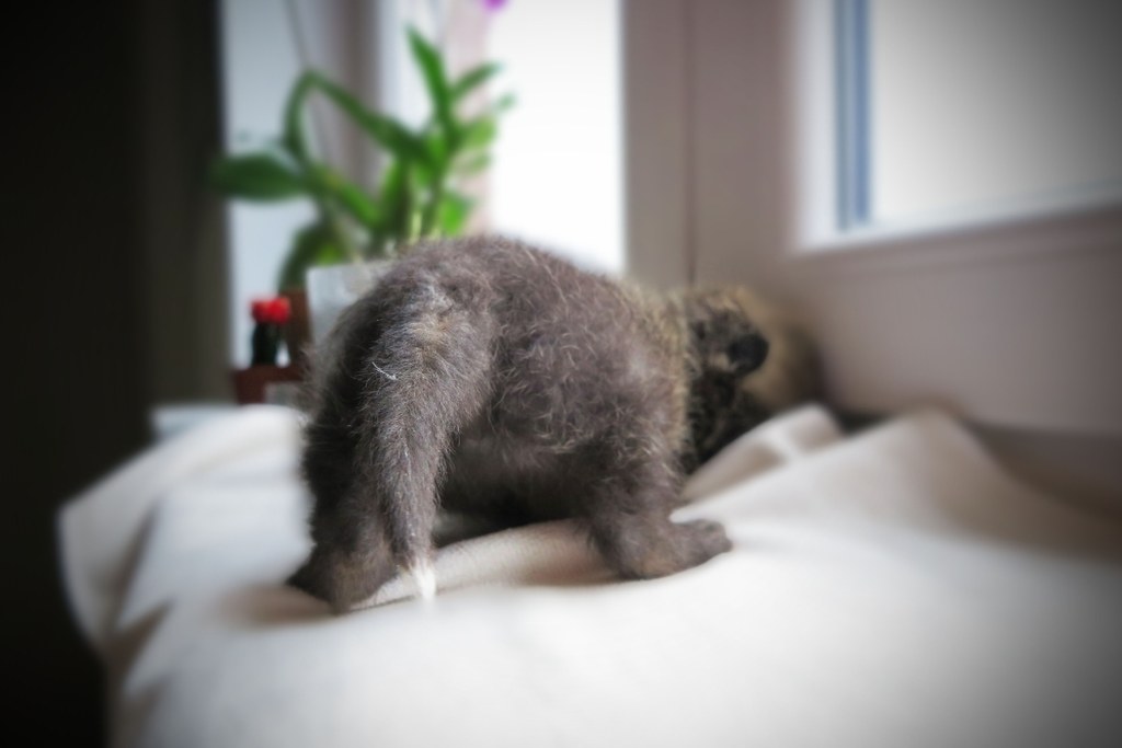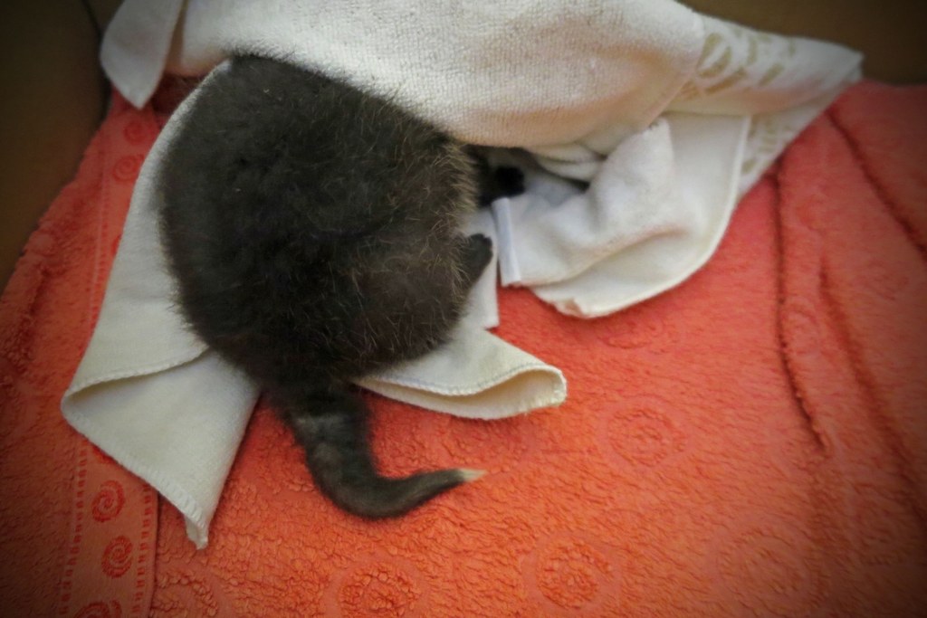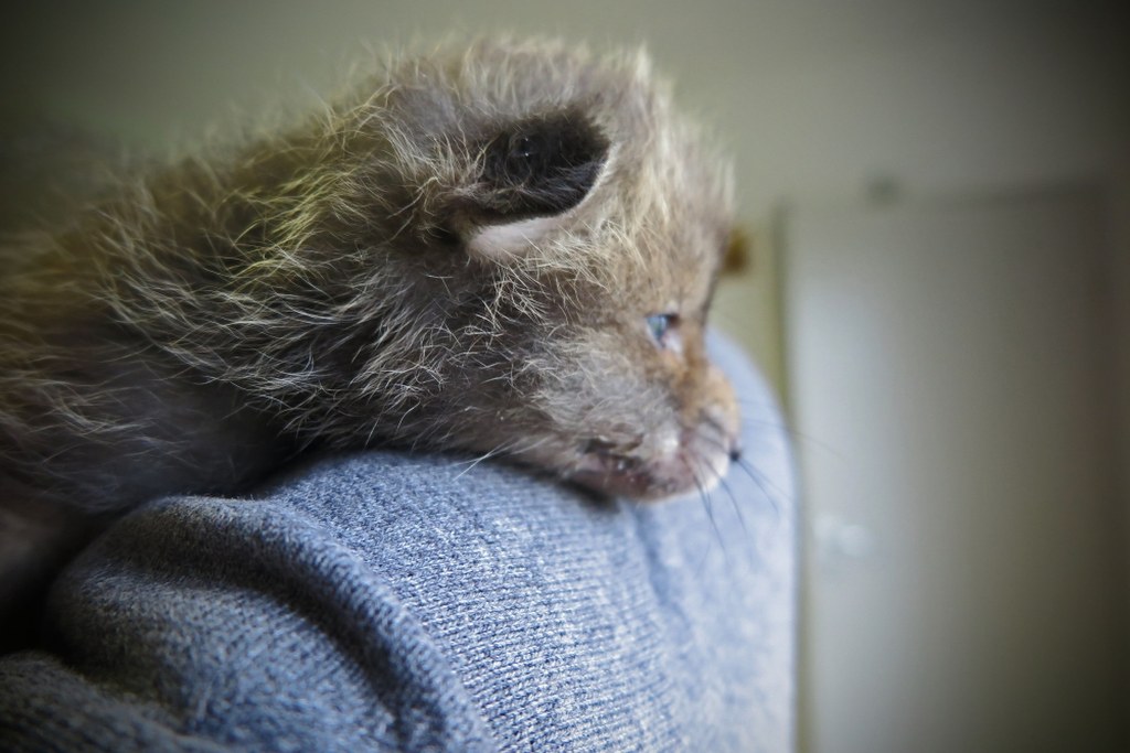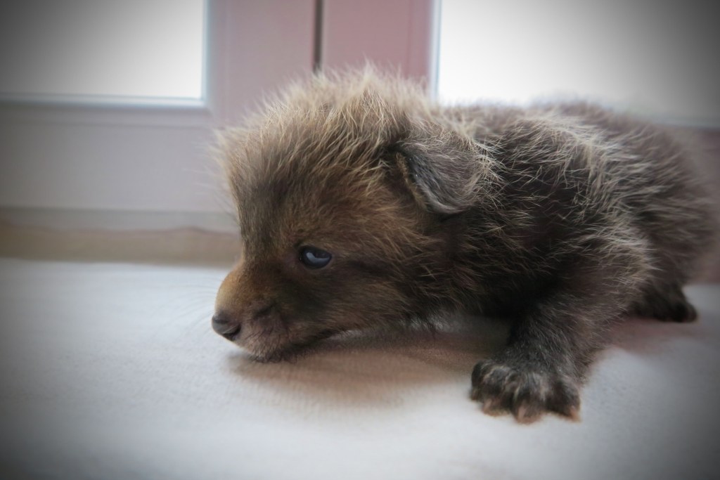 Lisek ma teraz ok. 2 tygodni. Niedawno otworzył oczy i głośno domaga się mleka, zwłaszcza w nocy. Powoli zaczyna też rudzieć.