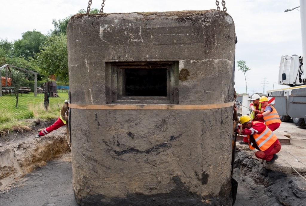 Trudność tej operacji polega na ciężarze. Schron ma ściany o grubości ok. metra, waży 70 ton, czyli tyle, co ok. 50 samochodów osobowych - mówi Maciej Szczyrbowski z firmy DROGPOL. Schron został przeniesiony 20 metrów na północ od swojej pierwotnej lokalizacji. Użyto do tego specjalistycznego dźwigu, ważącego 300 ton.
