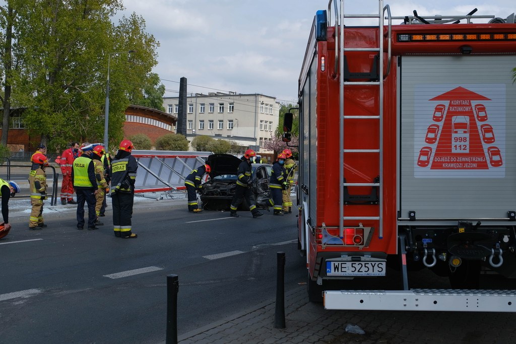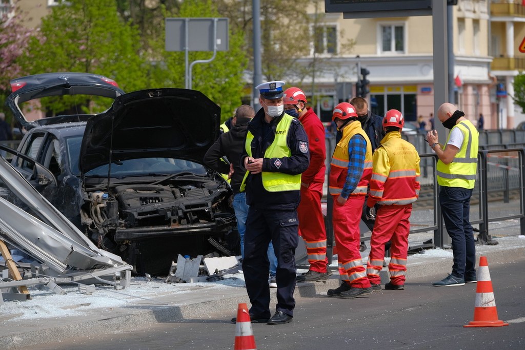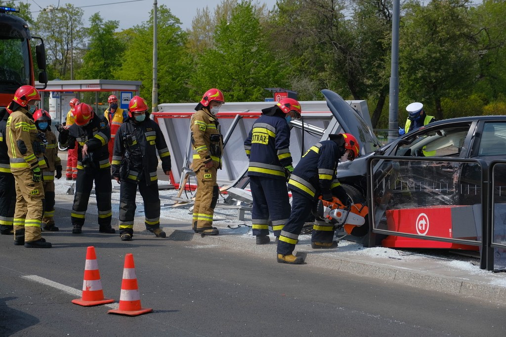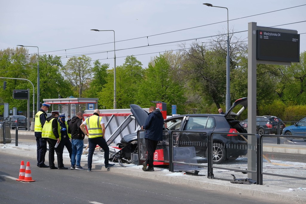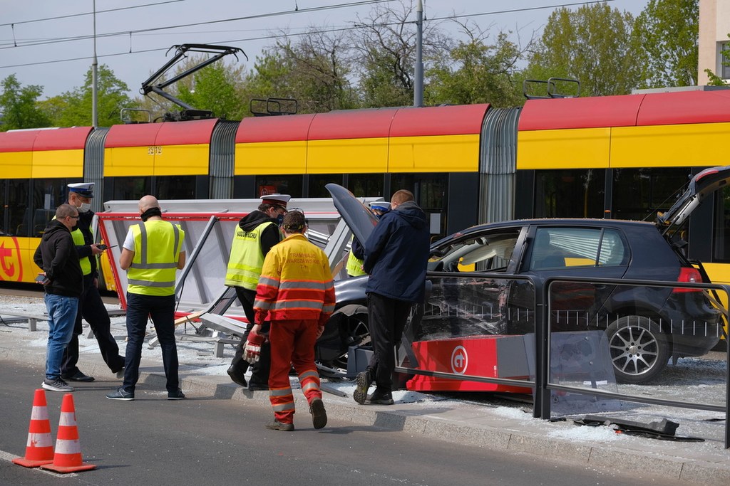 Jak informuje TVN24, czarny golf najpierw uderzył w audi, potem wjechał w wiatę przystankową, która przewróciła się na tramwaj. Ściął przy okazji biletomat i barierki.