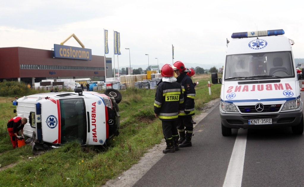 W Nowym Targu kierowca karetki chcąc uniknąć zderzenia z zawracającą ciężarówką zjechał do rowu. W karetce było trzech członków załogi. Jeden ratownik zmarł.