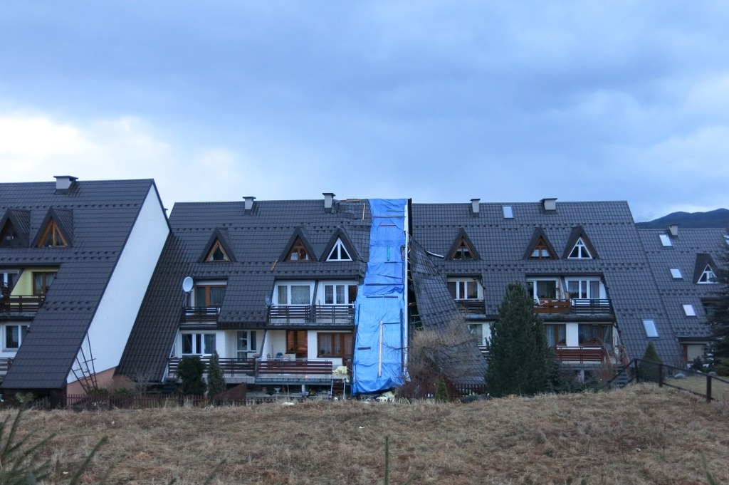 Strażacy interweniowali w związku wichurami na południu kraju ponad 300 razy. Najwięcej pracy mieli na Podhalu. Najbardziej ucierpiała górna część Zakopanego - tam najmocniej wiało. Pod Nosalem zanotowano podmuchy sięgające 110 km/h. Tam zostało uszkodzonych najwięcej dachów. Mieszkańcy osiedla Pardałówka relacjonują w rozmowie z naszym reporterem, że wiało potężnie, a w nocy słyszeli tylko huk: Huk, trochę szumu, uderzenia blachy. Nie mamy teraz dachu nad częścią mieszkań - mówi jeden z rozmówców. Strażacy w nocy zabezpieczyli jego dach folią, a dziś brygada ma go naprawiać.