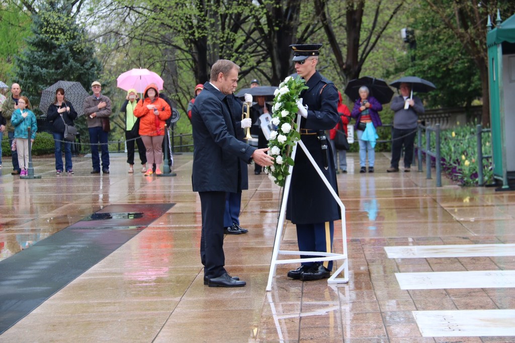Przed spotkaniem z dziennikarzami przewodniczący Rady Europejskiej Donald Tusk złożył wieniec przy Grobie Nieznanego Żołnierza na Cmentarzu Wojskowym Arlington pod Waszyngtonem. Na cmentarzu pochowanych jest około 300 tys. osób. Są to weterani wszystkich wojen, w których brały udział Stany Zjednoczone - od rewolucji amerykańskiej, po wojny w Iraku i Afganistanie.