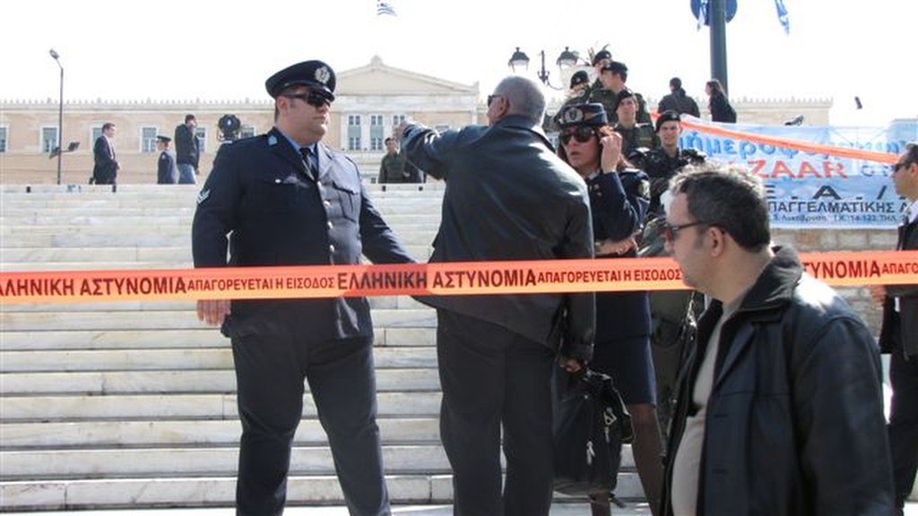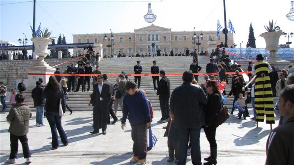 W Atenach już od rana czuć było świąteczną atmosferę. Ruch uliczny w peryferyjnych dzielnicach i w centrum był zdecydowanie mniejszy niż zazwyczaj. Większość sklepów nie została otwarta. Od godz. 9 odświętnie ubrane rodziny greckie podążały do centrum, na Plac Konstytucji - miejsce głównych obchodów Dnia Niepodległości. Wszyscy kupowali miniaturowe flagi Grecji od ulicznych sprzedawców. Handlowali nimi głównie Pakistańczycy i Afgańczycy (cena: około jednego euro).