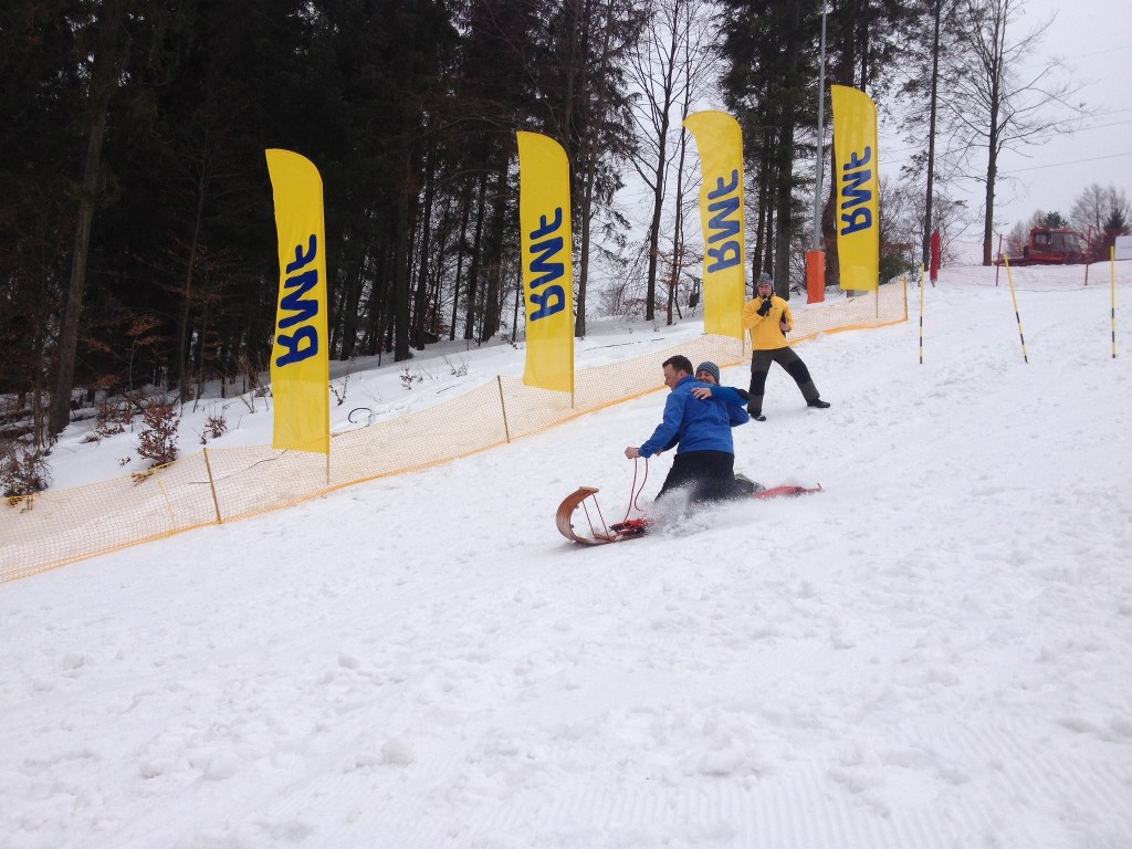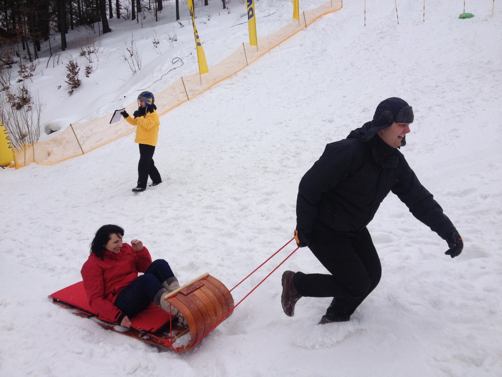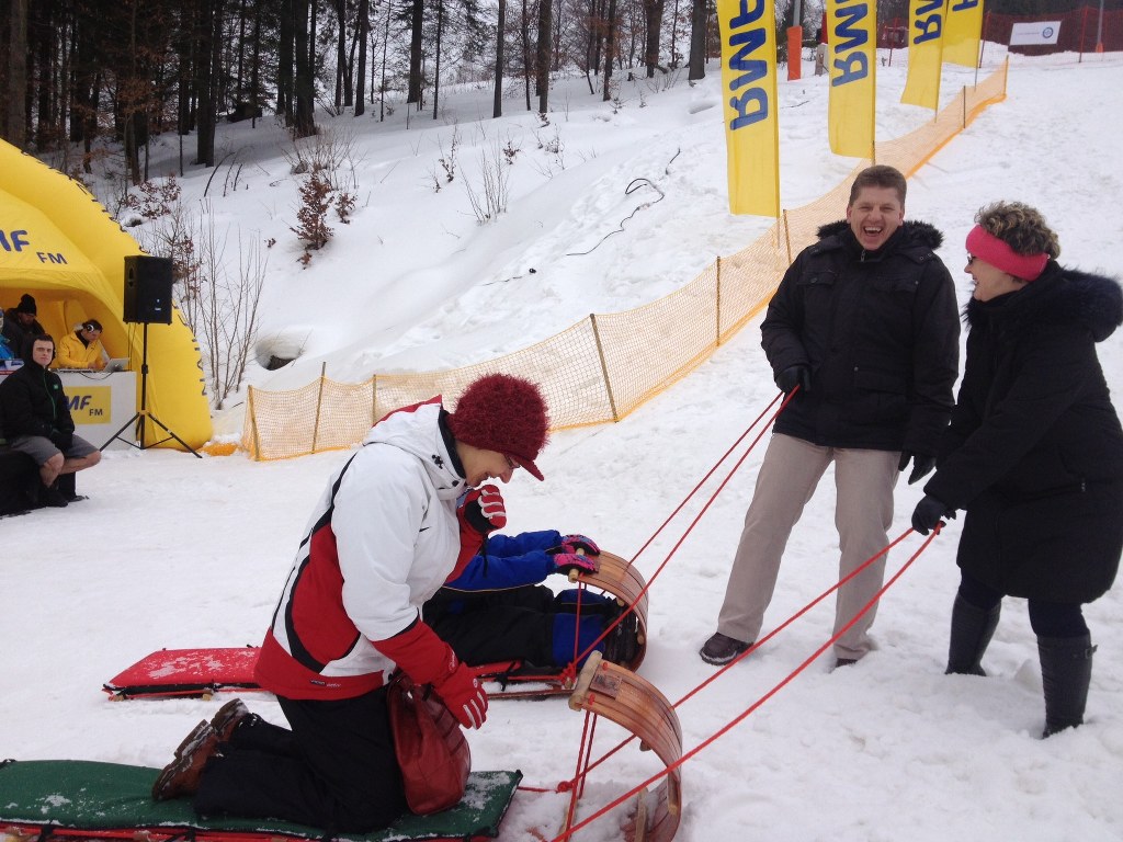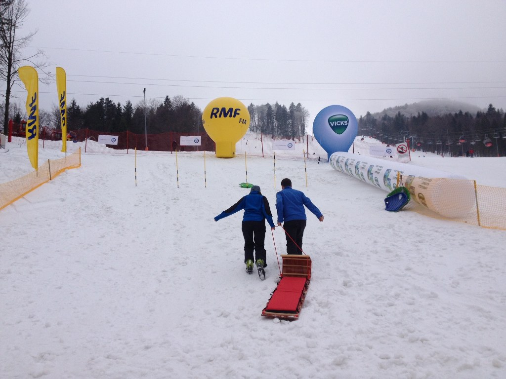 Dwustopniowy mróz, ponad metr śniegu - to idealne warunku na aktywne spędzenie weekendu w górach. Na Jaworzynie Krynickiej wspólnie bawią się narciarze i snowboardziści w nietypowej jak dla siebie konkurencji, zjeżdżaniu na saniach.