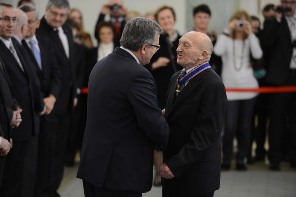Prezydent Bronisław Komorowski odznacza Krzyżem z Mieczami Orderu Krzyża Niepodległości Jana Ostańskiego. / fot. Jacek Turczyk (PAP)