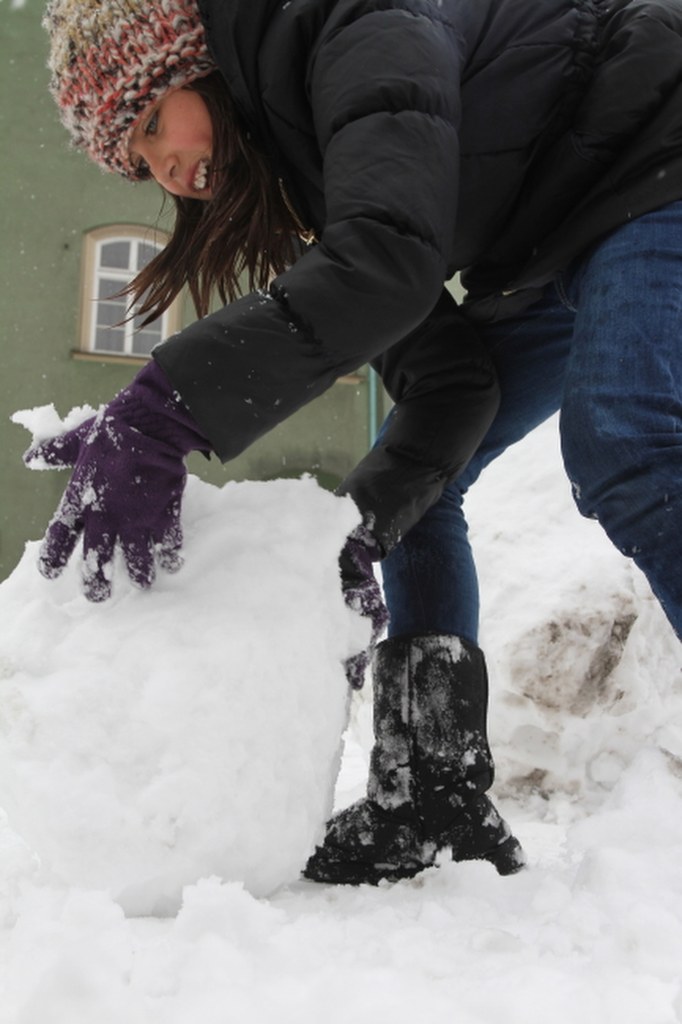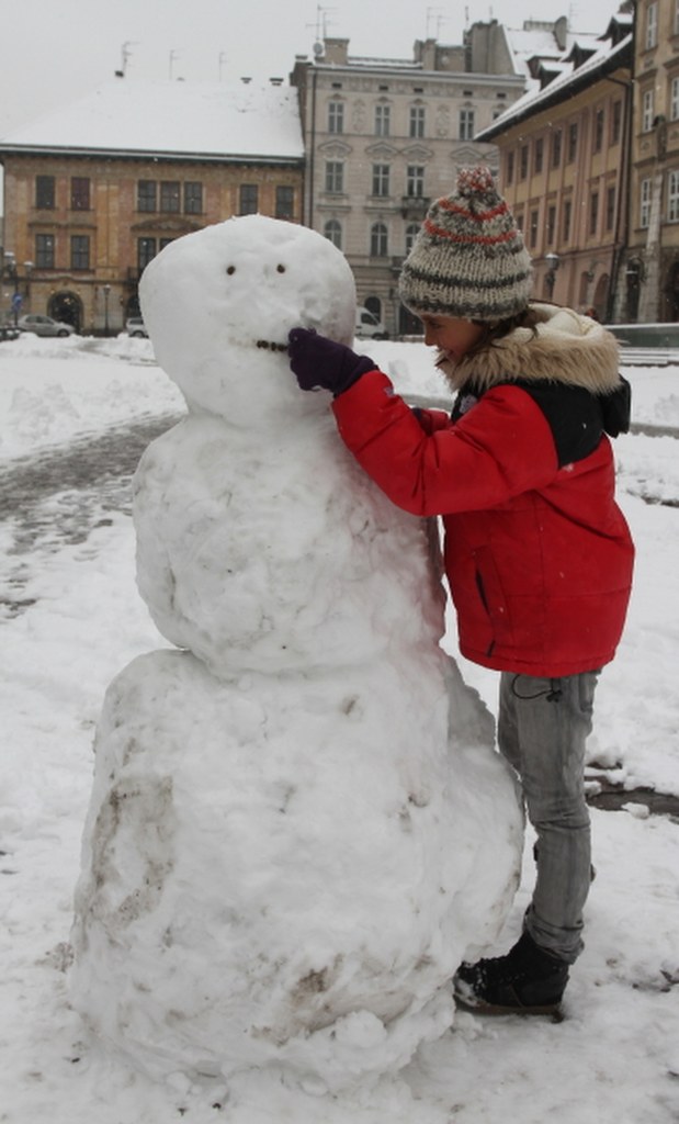 Mimo iż prognozy pogody na zbliżającą się Wielkanoc nie są optymistyczne, dzieciom to nie przeszkadza. W wiosenny zaśnieżony poranek dziewczynki lepią bałwana na Małym Rynku w Krakowie.