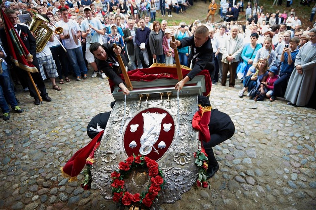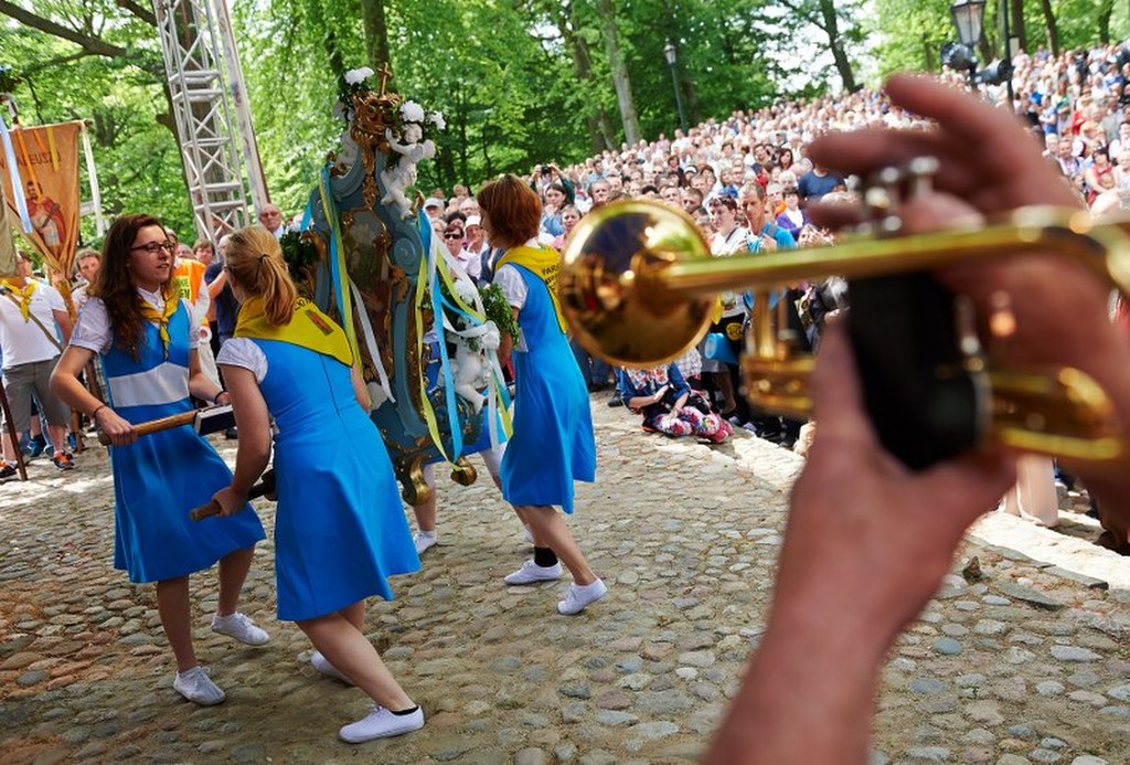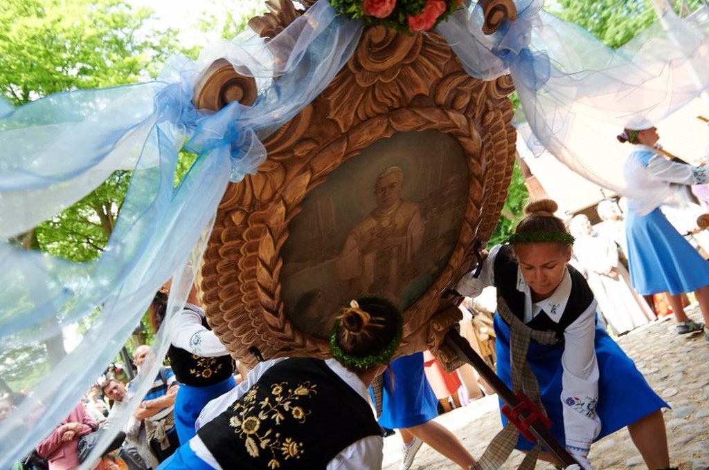 "Taniec" jednego z feretronów na zakończenie uroczystości odpustowych Wniebowstąpienia Pańskiego na Kalwarii Wejherowskiej. "Taniec" feretronów jest kaszubskim zwyczajem znanym od setek lat. Obraźnicy kłaniają się wykonując feretronem znak krzyża i zataczają koło. Zataczanie koła ma wychwalać doskonałość nieskończonego Boga, a znak krzyża łączy się z gestem błogosławieństwa.