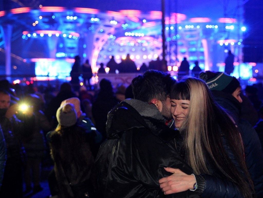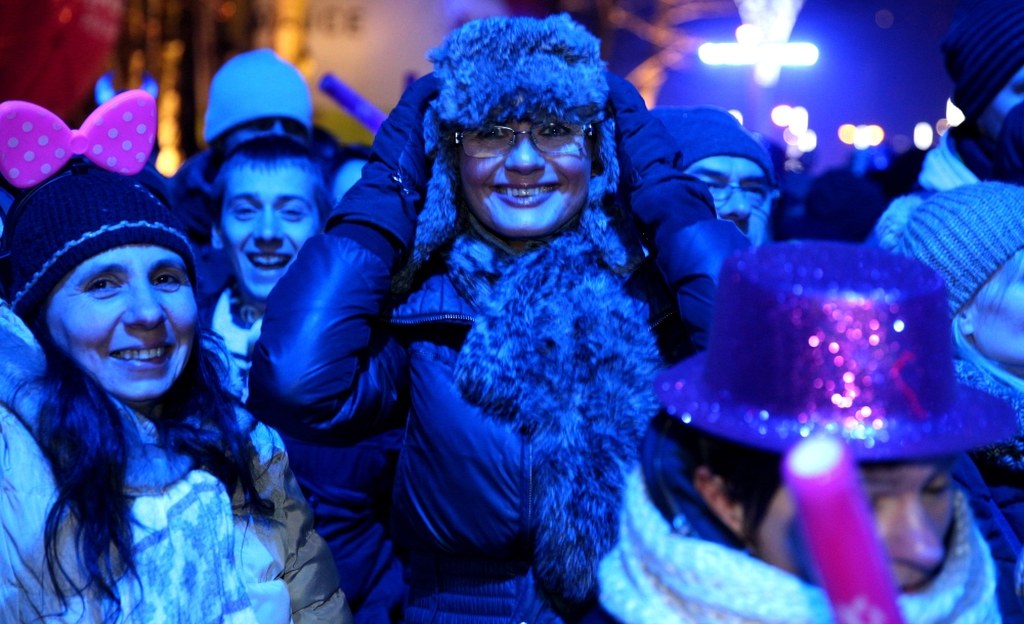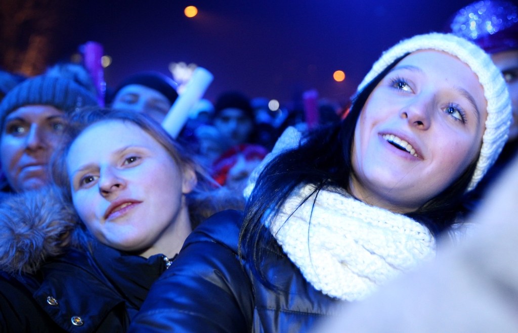 Publiczność podczas Sylwestrowej Mocy Przebojów 2015 Telewizji Polsat i RMF FM- sylwestrowej zabawy przed Spodkiem w Katowicach.
