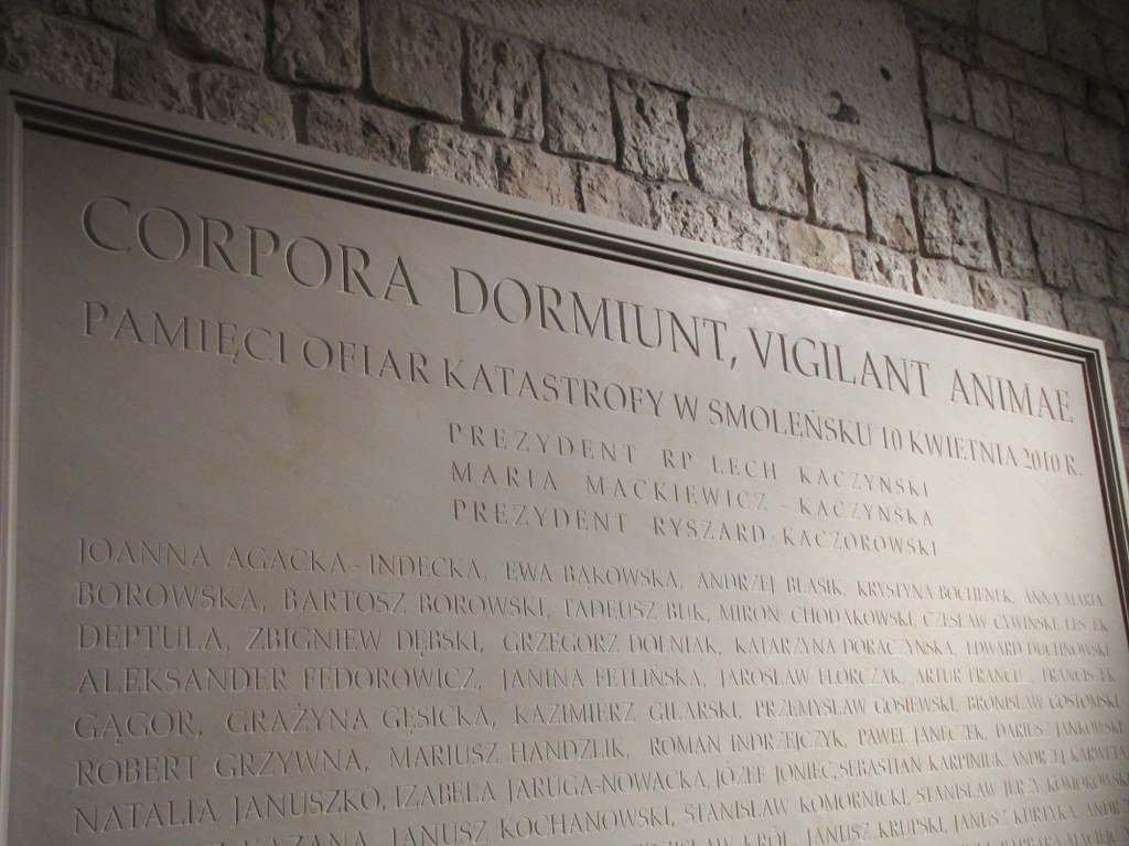 Tablica upamiętniająca osoby, które zgninęły pod Smoleńskiem, wisząca w krypcie pod wieżą Srebrnych Dzwonów. / fot. Maciej Grzyb / RMF FM