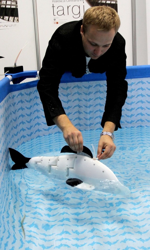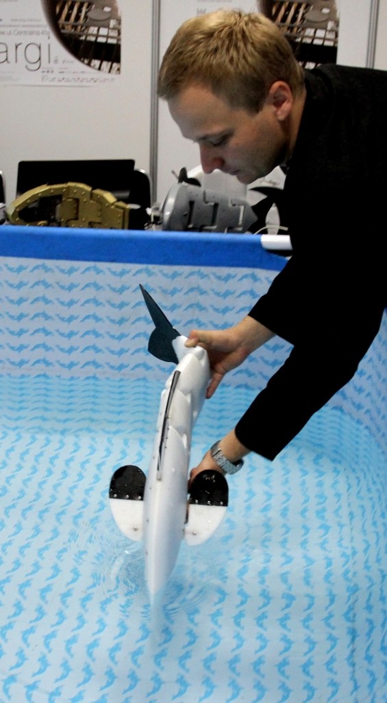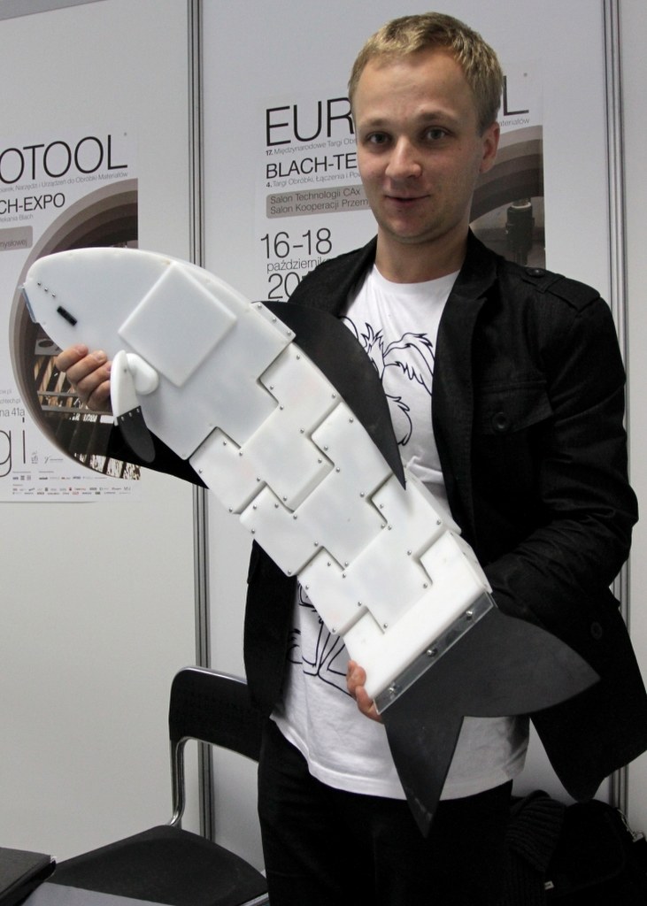 Marcin Malec prezentuje prototyp CyberRyby. / PAP/EPA