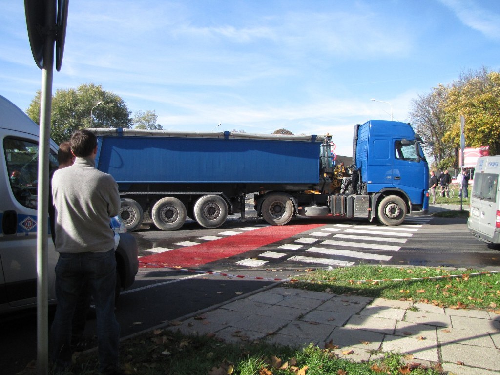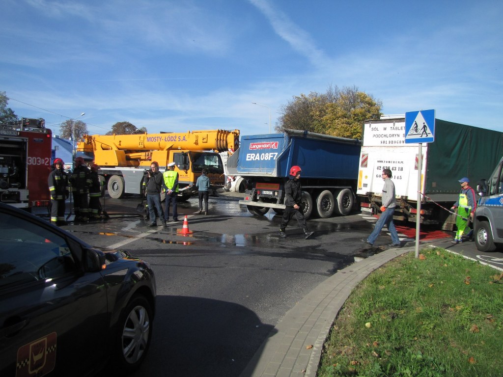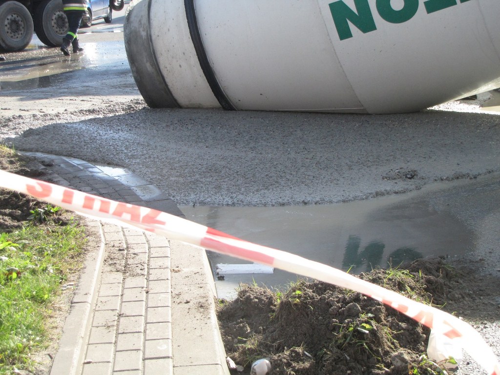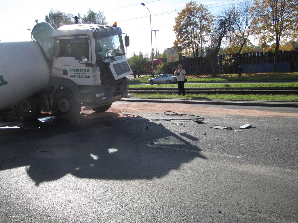 W Łodzi na drodze krajowej nr 1 w stronę Gdańska, czyli Al. Włókniarzy przy skrzyżowaniu z ul. 6 Sierpnia zderzyły się dwa samochody ciężarowe i betoniarka. Droga jest nieprzejezdna, bo beton wylał się na jezdnię. Wyciekła połowa zawartości betoniarki. Ranny jest jeden z kierowców, który ma obrażenia wewnętrzne oraz złamania rąk i nóg. Został przewieziony do szpitala.