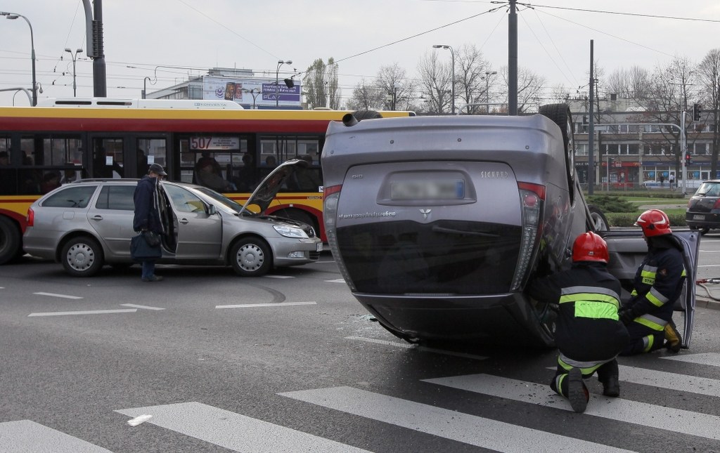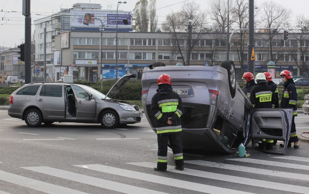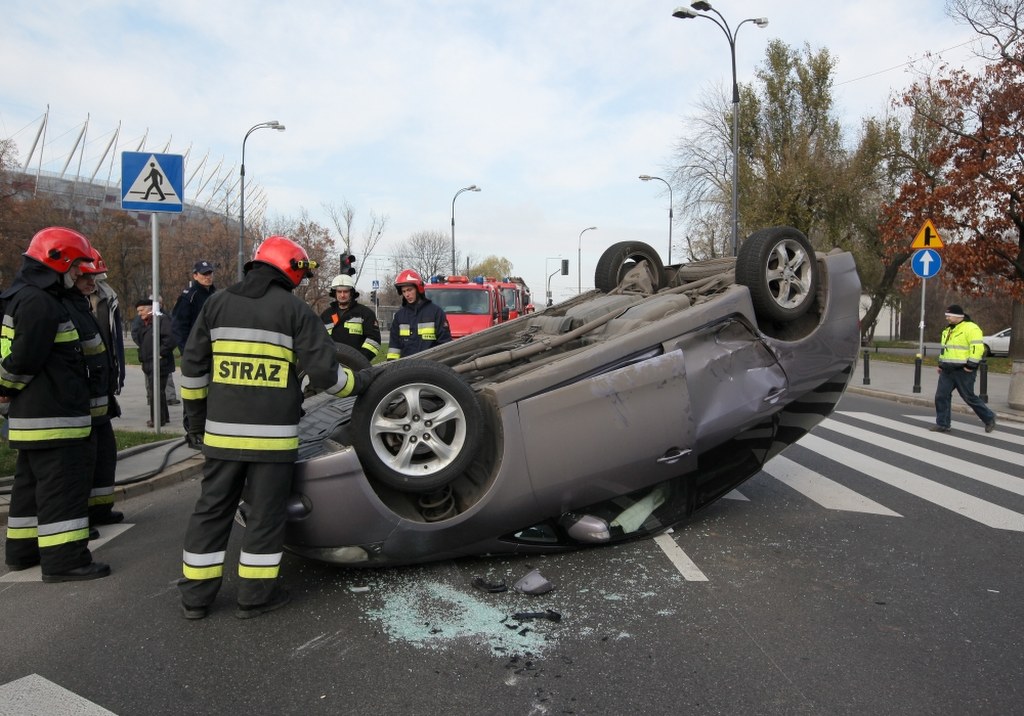 Strażacy muszą podjąć decyzję w jaki sposób postawić auto na "nogi" / fot. PAP/ Paweł Supernak