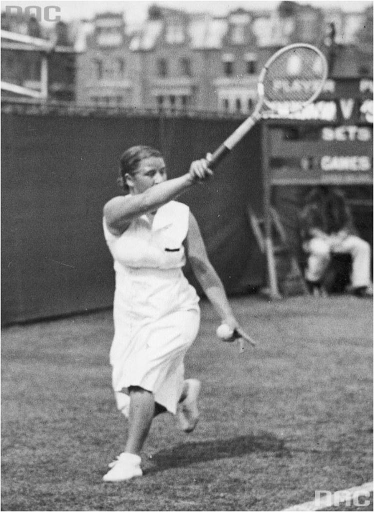 Jadwiga Jędrzejowska podczas zmagań w Międzynarodowym Turnieju Tenisa Ziemnego w Queen`s Club w Londynie, rok 1936. / fot. Narodowe Archiwum Cyfrowe