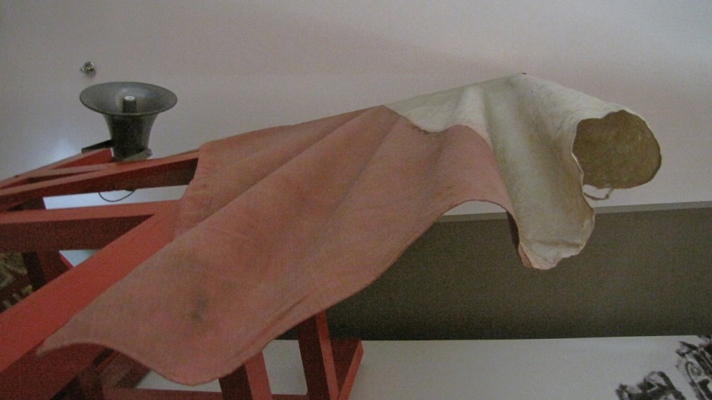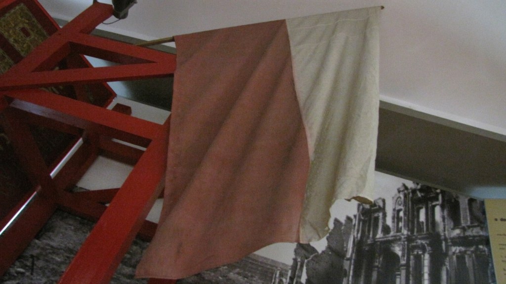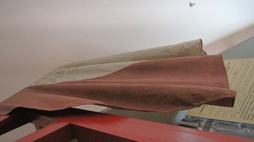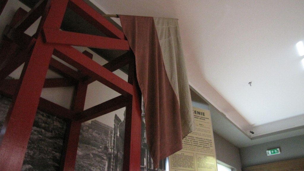 Flaga została uszyta w hitlerowskim obozie pracy przymusowej znajdującym się na Sołtysowicach przez więźniarkę Natalię Kujawińską. Wykonano ją z jedynego dostępnego w obozie materiału, czyli białej adamaszkowej poszewki i czerwonej poszewki bawełnianej. / fot. Barbara Zielińska-Mordarska / RMF FM