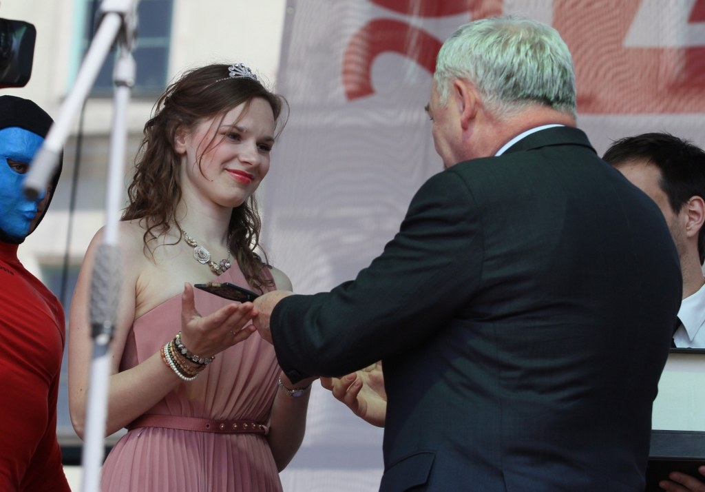 Prezydent Jacek Majchrowski przekazuje klucze do miasta najmilszej studentce Krakowa, Joanny Guniewicz z UJ / PAP
