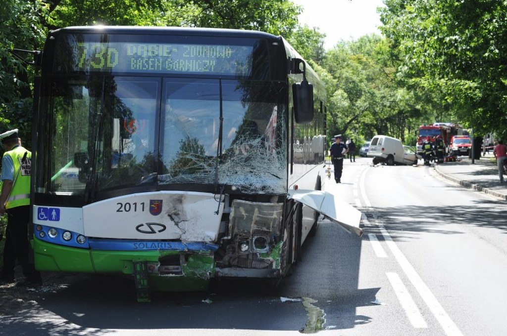 Do czołowego zderzenia autobusu linii 73 z samochodem osobowym doszło na ulicy Przestrzennej w Szczecinie. Na miejscu zginął kierowca samochodu osobowego, są ranni wśród pasażerów autobusu.