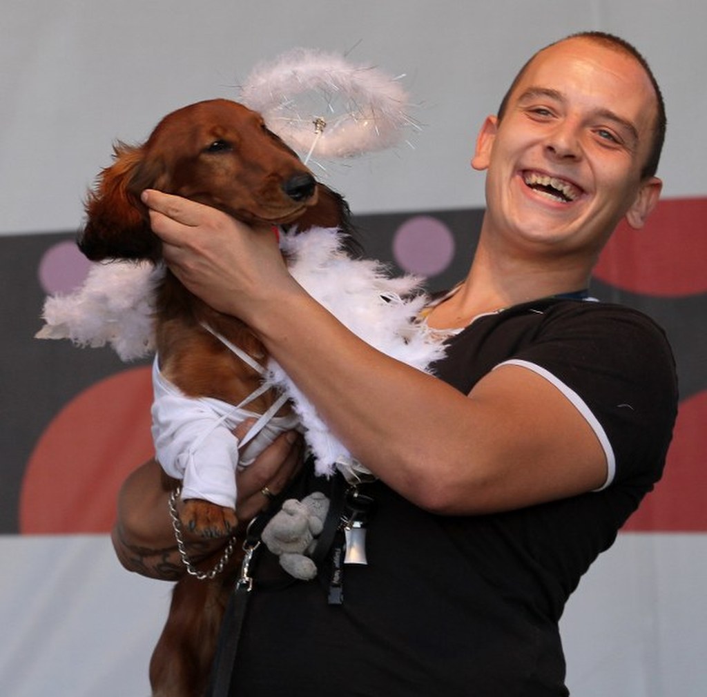 "Anielski" Nadim - zwycięzca parady mierzący 82,5 cm. długości pozuje do zdjęcia ze swoim panem. / fot. Jacek Bednarczyk (PAP)